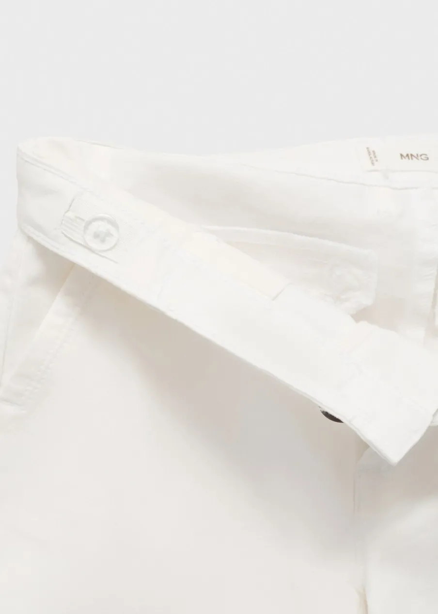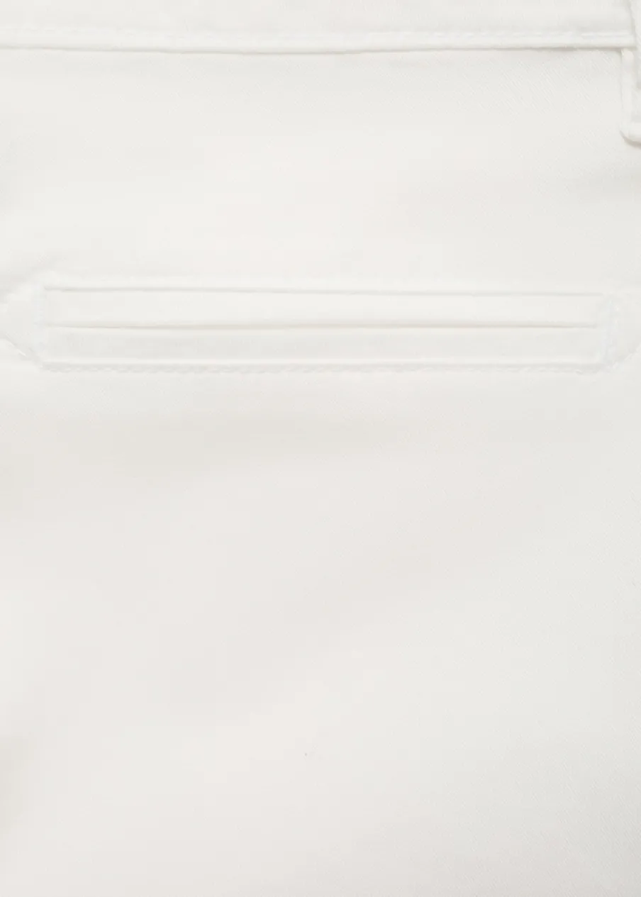 Bawełniana tkanina. Model prosty. Krótki krój. Szlufki. Regulowany pas. Dwie kieszenie z przodu. Dwie wpuszczane kieszenie z tyłu. Zapięcie na guzik z przodu.