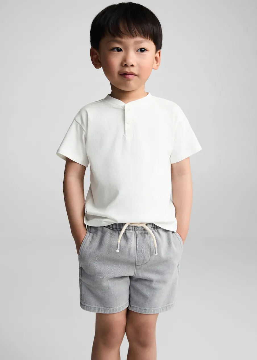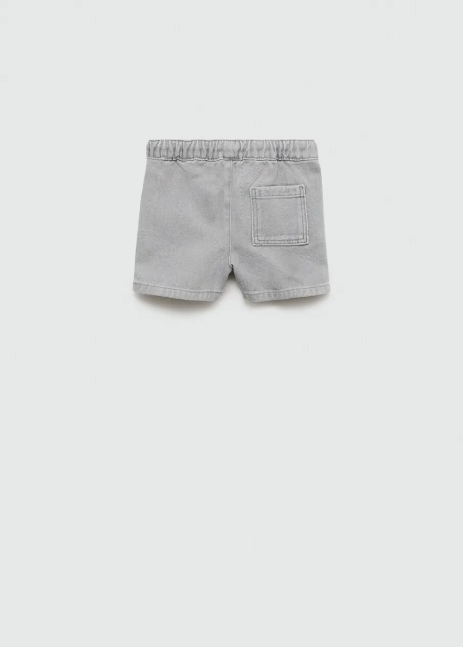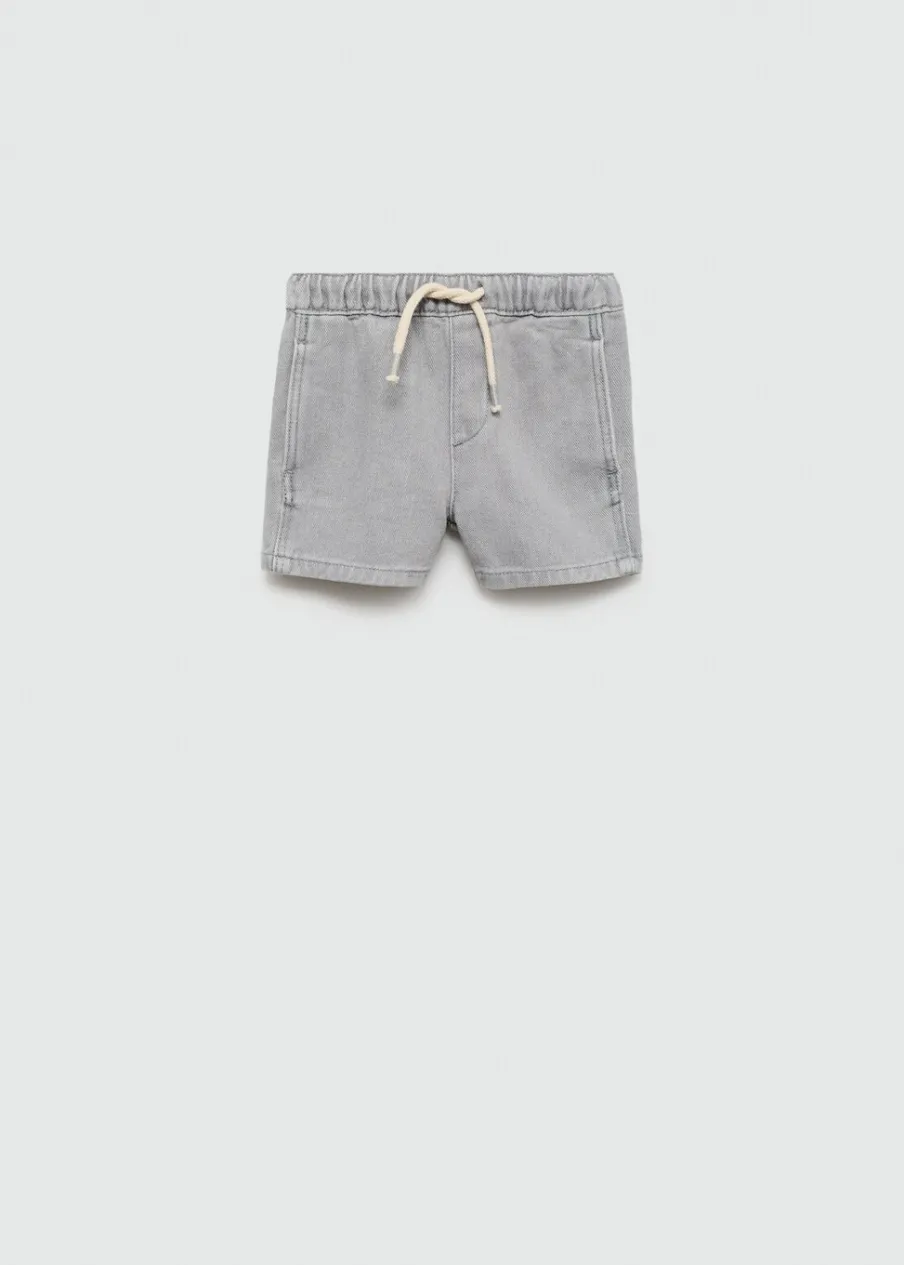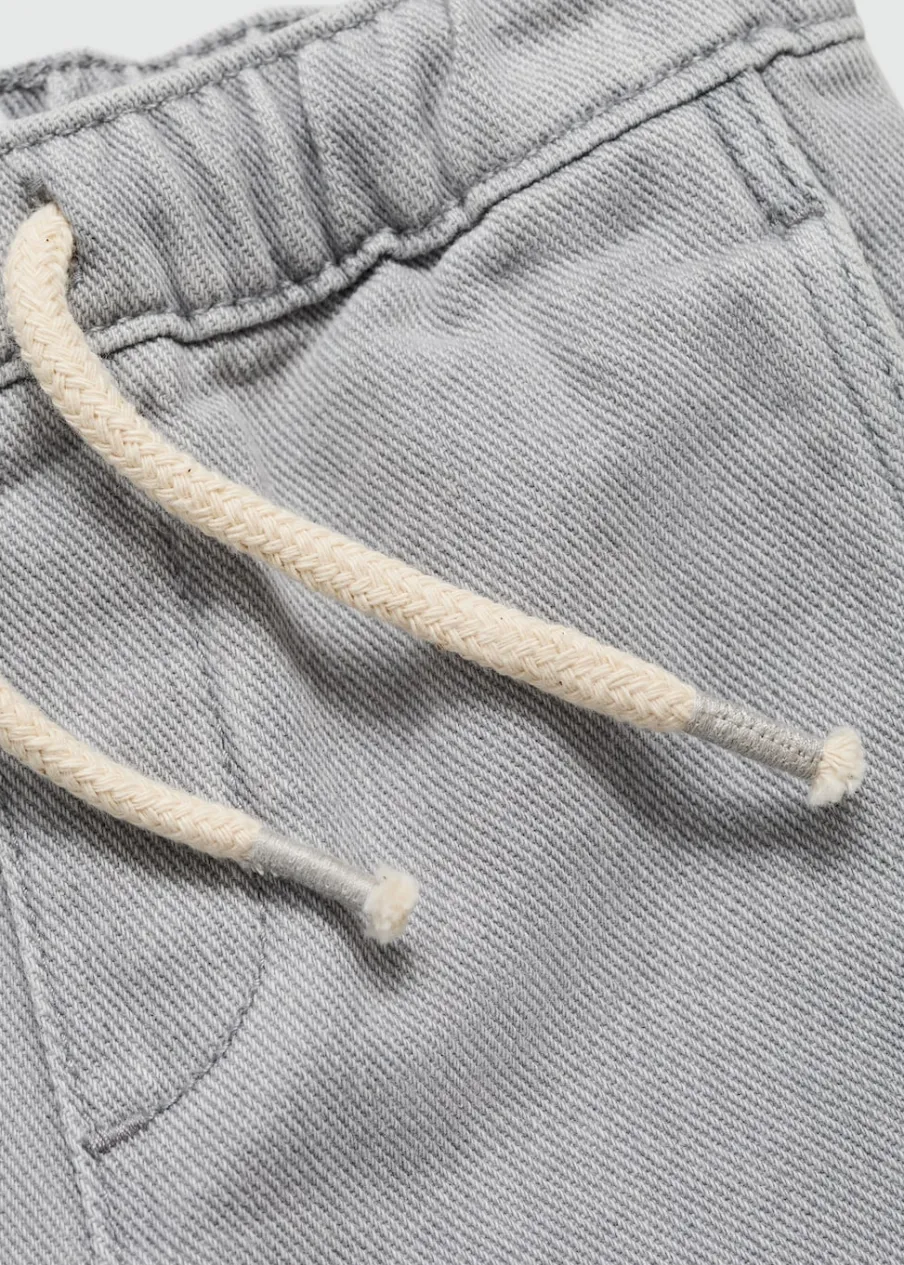 Tkanina bawełniana w dżinsowym stylu. Model prosty. Krótki krój. Elastyczny pas. Dwie kieszenie z patką. Wiązanie na sznurek.