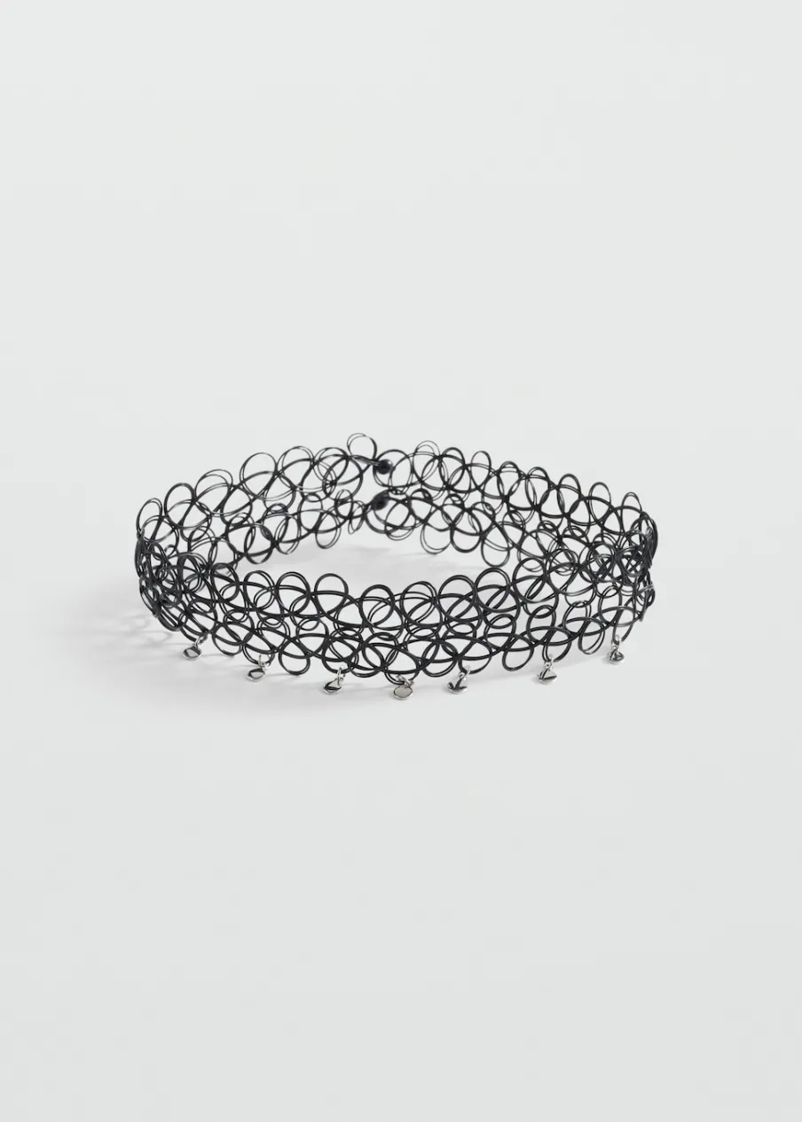 W stylu choker. Metalowe koraliki. Elastyczne wykończenie. Zapięcie z tyłu.