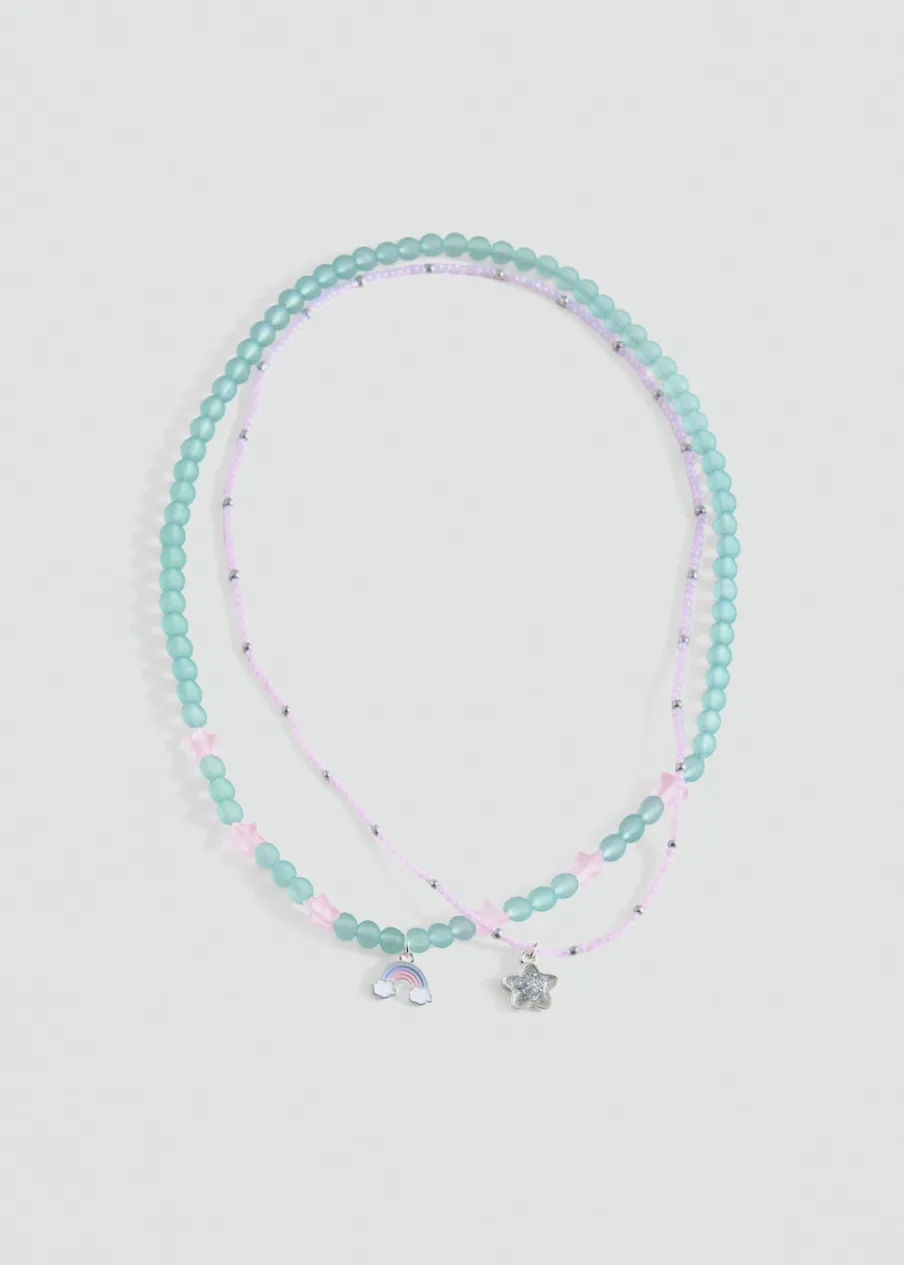 Zestaw 2 szt. Połączenie różnych koralików. Ozdobna gwiazdka. Naszyjnik z wisiorem tęczą. Elastyczne wykończenie.