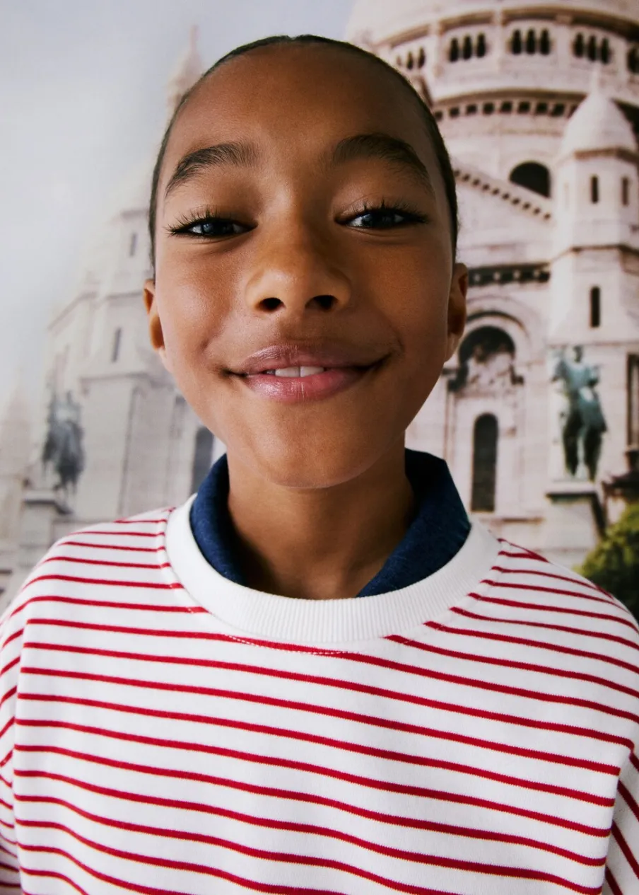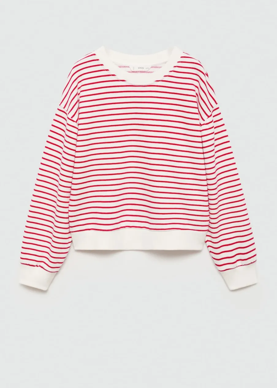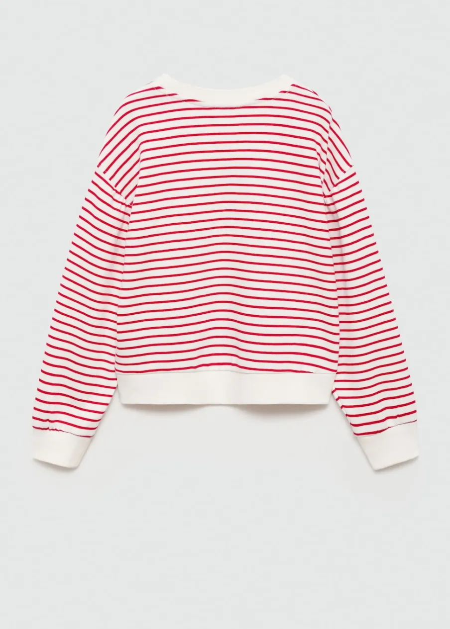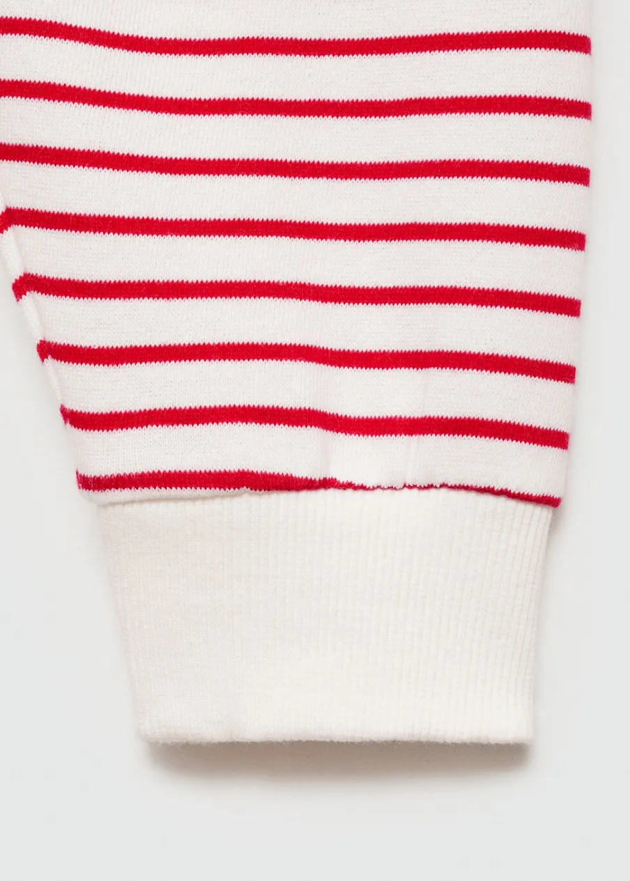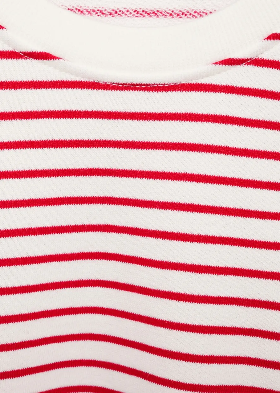 100% bomull. Model prosty. Wzór w pasy. Okrągły dekolt. Długi rękaw. Bez zapięcia.
