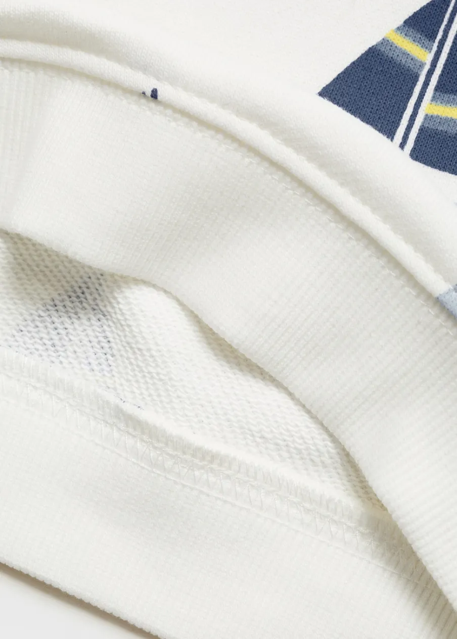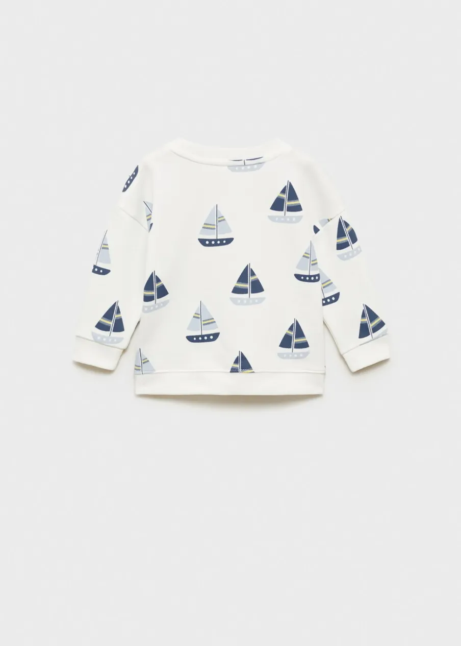 Tkanina z 100% bawełny. Model prosty. Wzór w łódki. Długi rękaw. Okrągły dekolt z prążkowanym wykończeniem. Mankiety i dół wykończone ściągaczem.