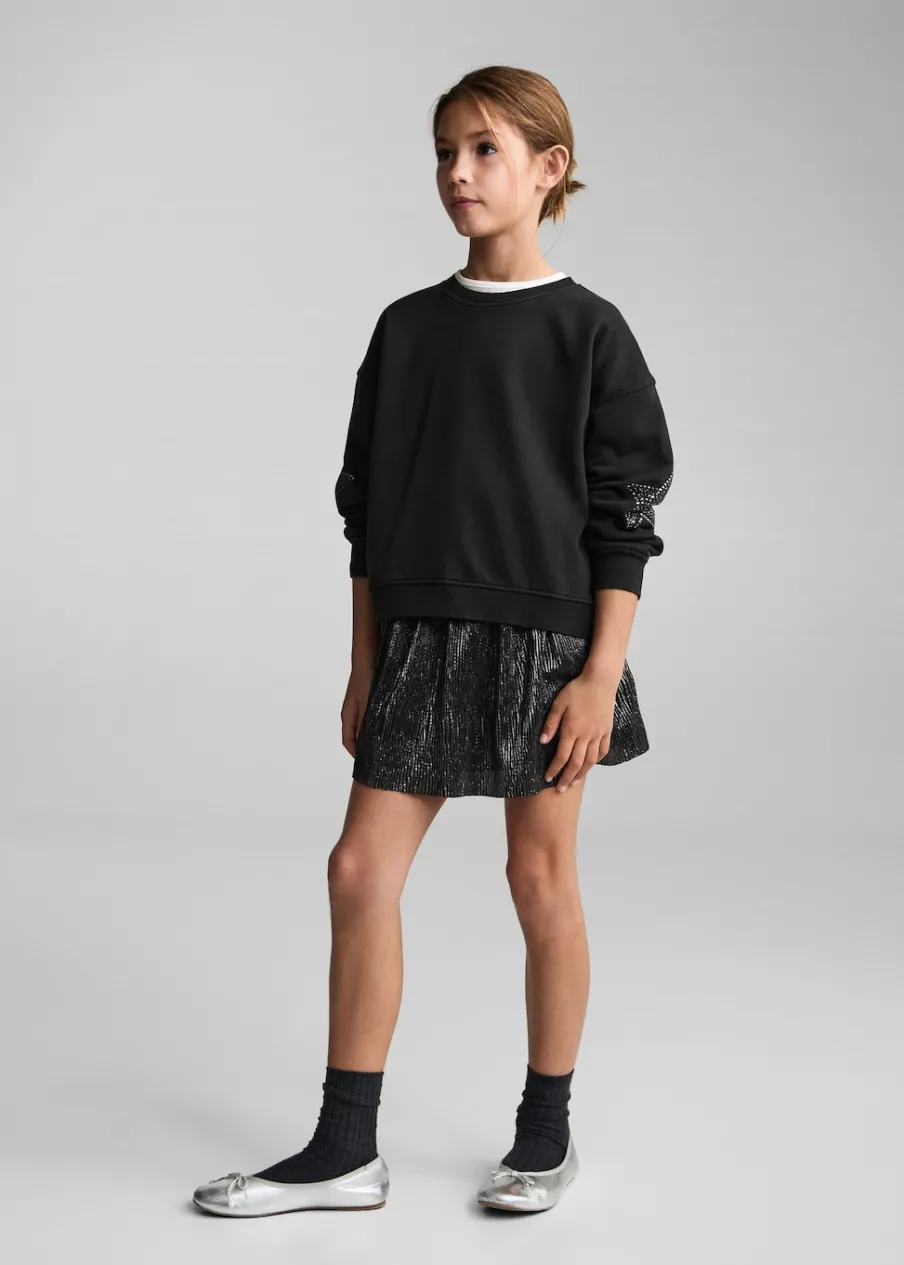 OpisBawełna 100%. Ozdobne ćwieki. Deseń w gwiazdki. Kolor z efektem sprania. Okrągły dekolt. Długi rękaw. Model p…