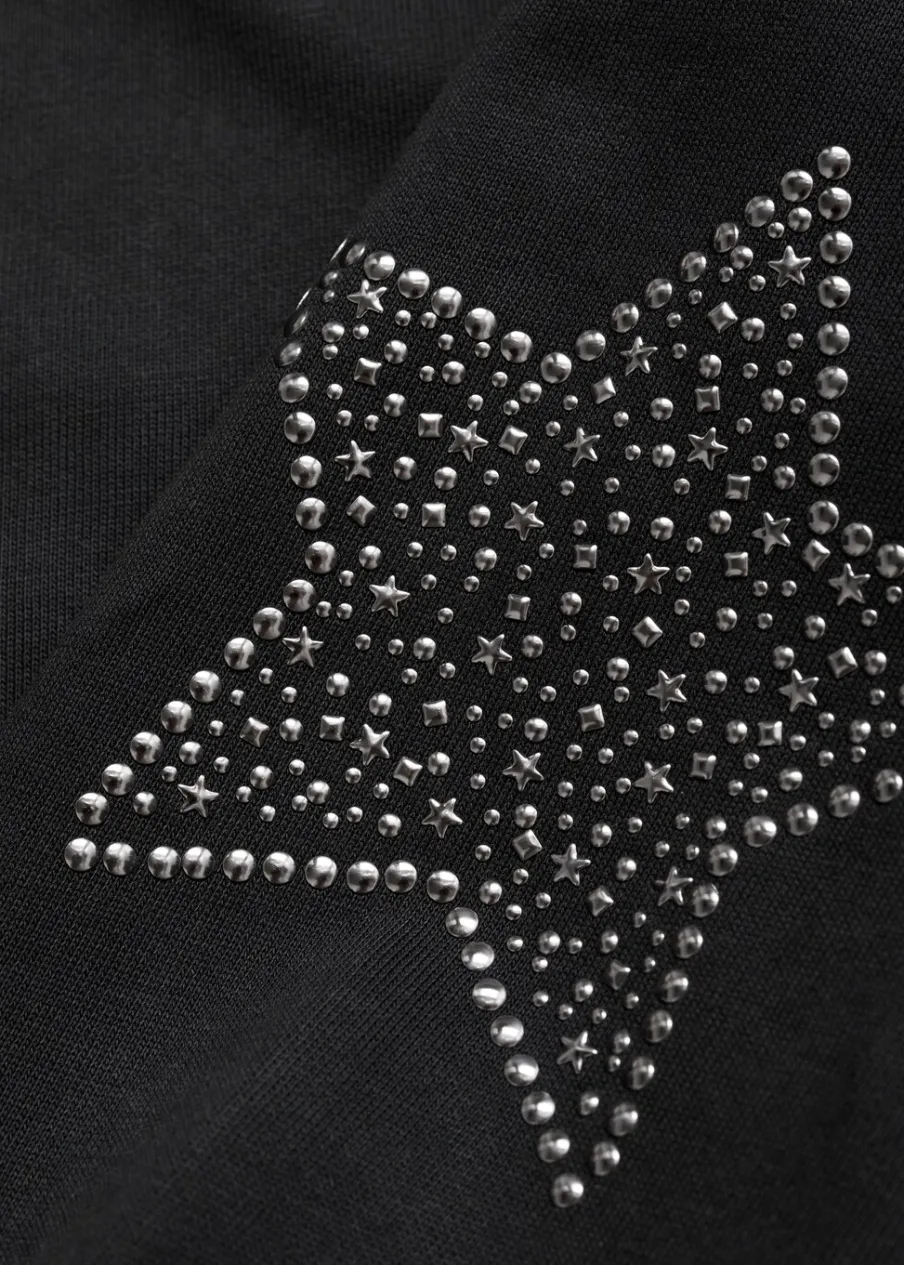 Bawełna 100%. Ozdobne ćwieki. Deseń w gwiazdki. Kolor z efektem sprania. Okrągły dekolt. Długi rękaw. Model prosty. Kolekcja wieczorowa i imprezowa.
