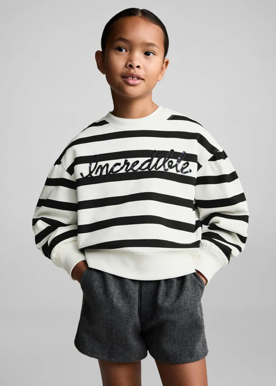 Bawełna 100%. Model prosty. Wzór w paski. Haftowany detal. Okrągły dekolt. Długi rękaw. Bez zapięcia. Cekinowy haft.