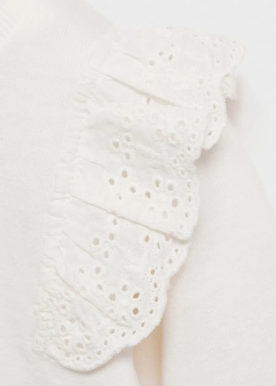 Bawełna 100%. Model prosty. Falbanka z haftem szwajcarskim. Kołnierz, mankiety i dół z prążkowanej dzianiny. Okrągły dekolt. Zapięcie przy szyi.