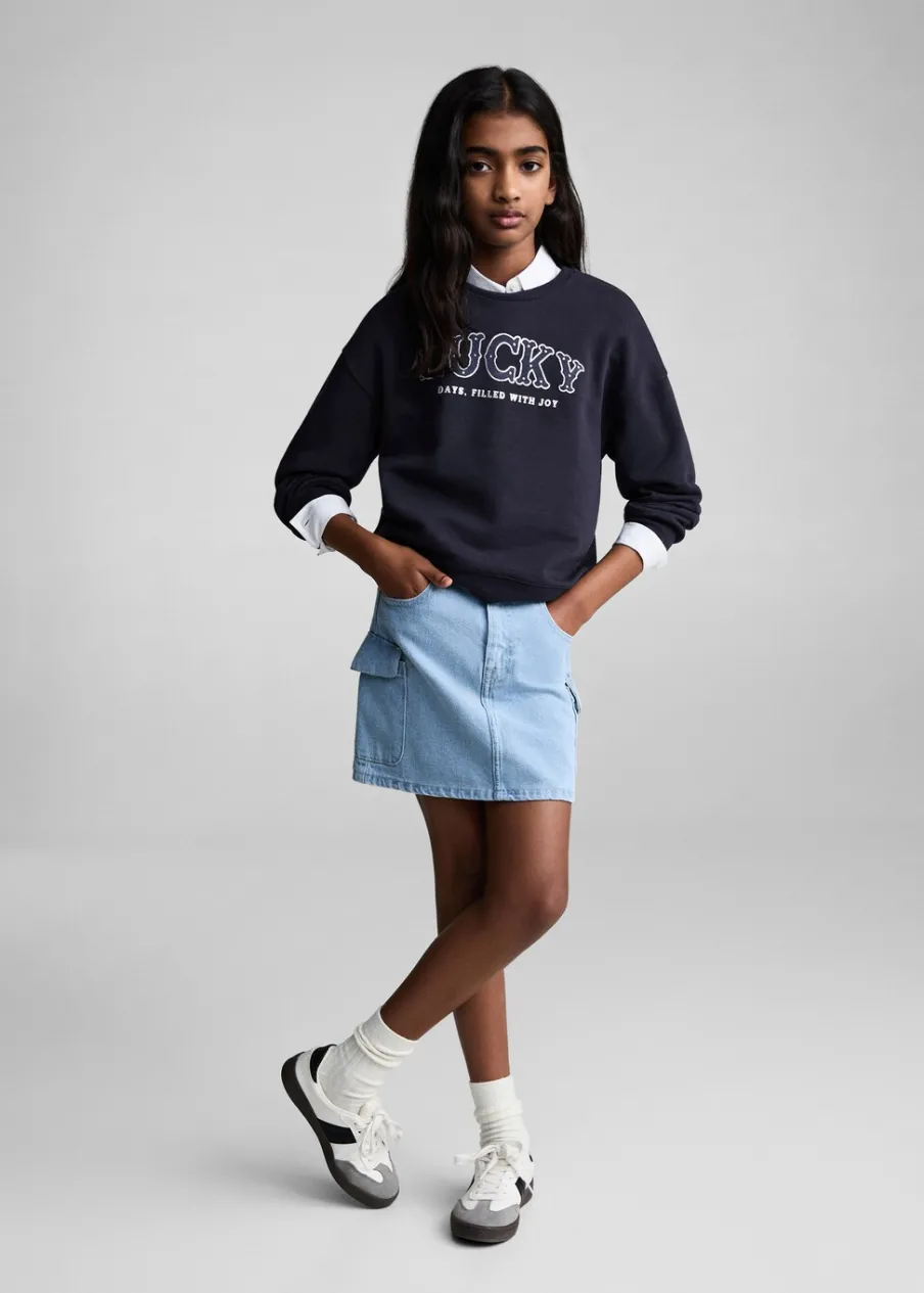 Tkanina z bawełną. Høyt liv. Model prosty. Wzorzysty. Wypukła tekstura. Okrągły dekolt. Długi rękaw. Bez zapięcia.