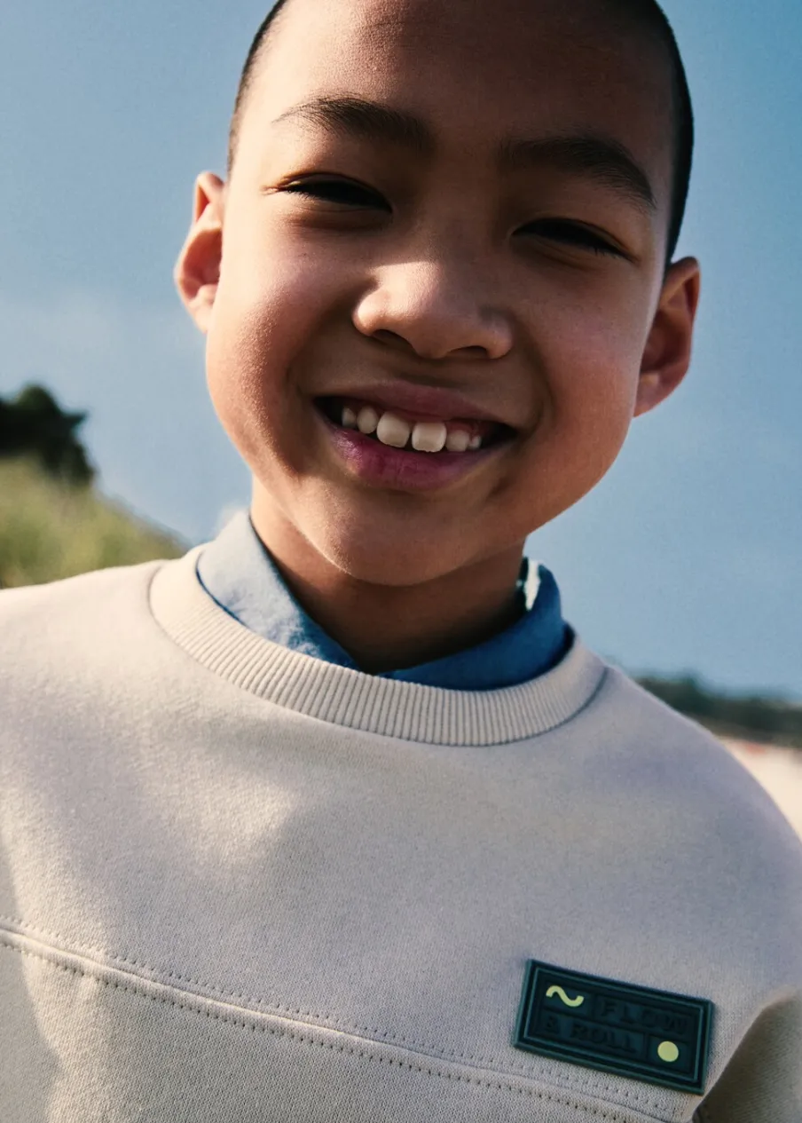 Kolekcja Powrót do szkoły. Tkanina z bawełną. Høyt liv. Haftowana naszywka. Ozdobna łatka. Wzór w litery. Okrągły dekolt. Długi rękaw. Bez zapięcia.