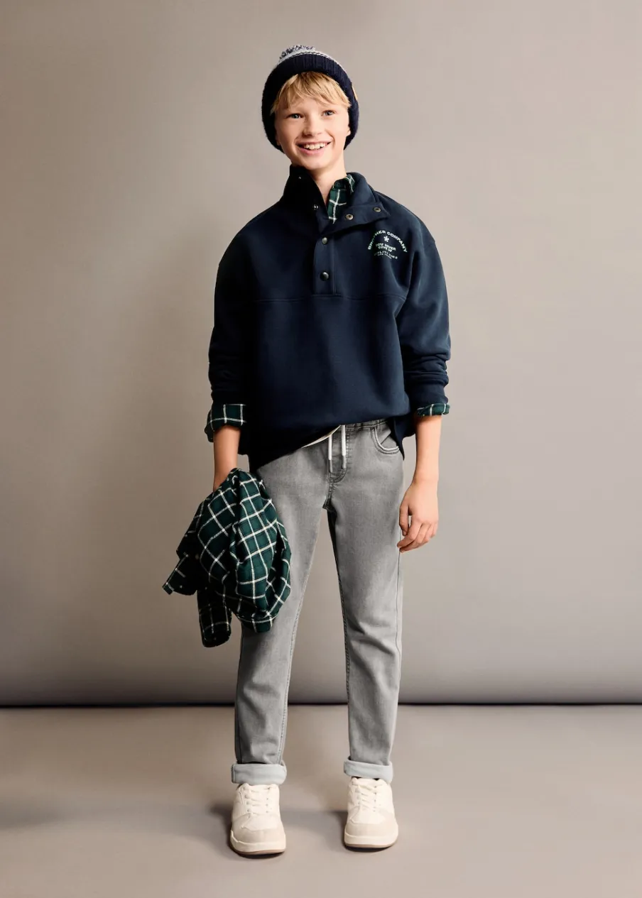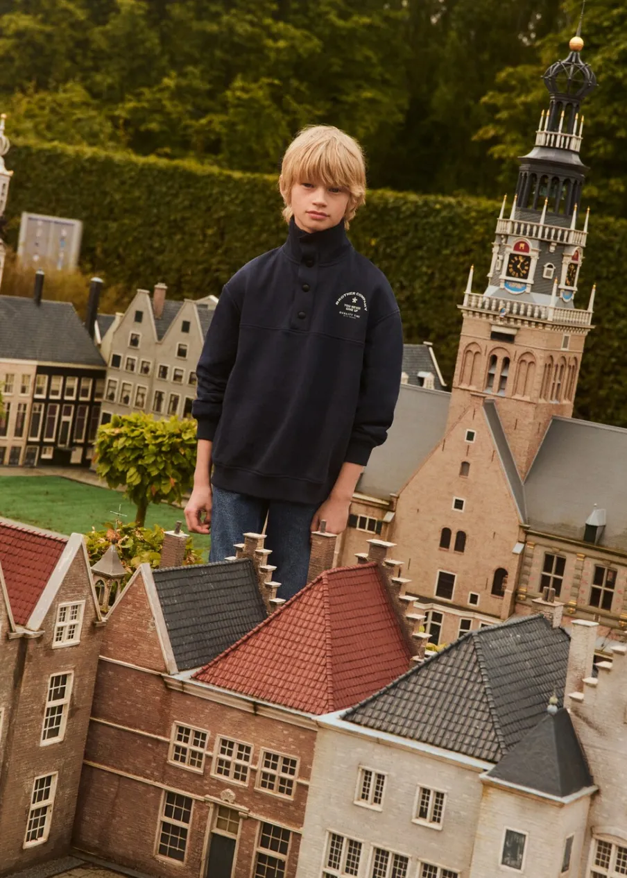 Długi rękaw. Tkanina z bawełną. Nadruk. Golf. Zapinany kołnierzyk. Model prosty.