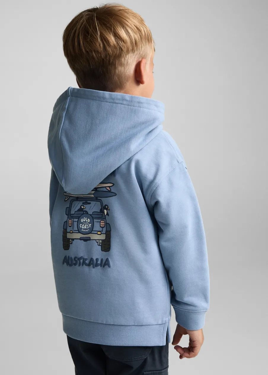 OpisBawełna 100%. Model prosty. Surferski nadruk. Kaptur. Długi rękaw. Bez zapięcia. Wysoka gramatura.