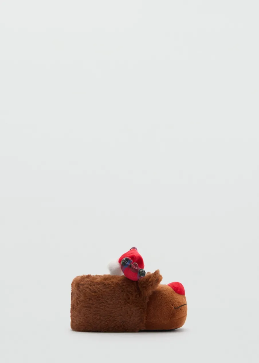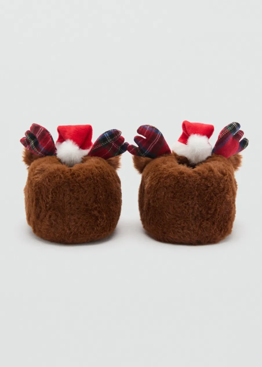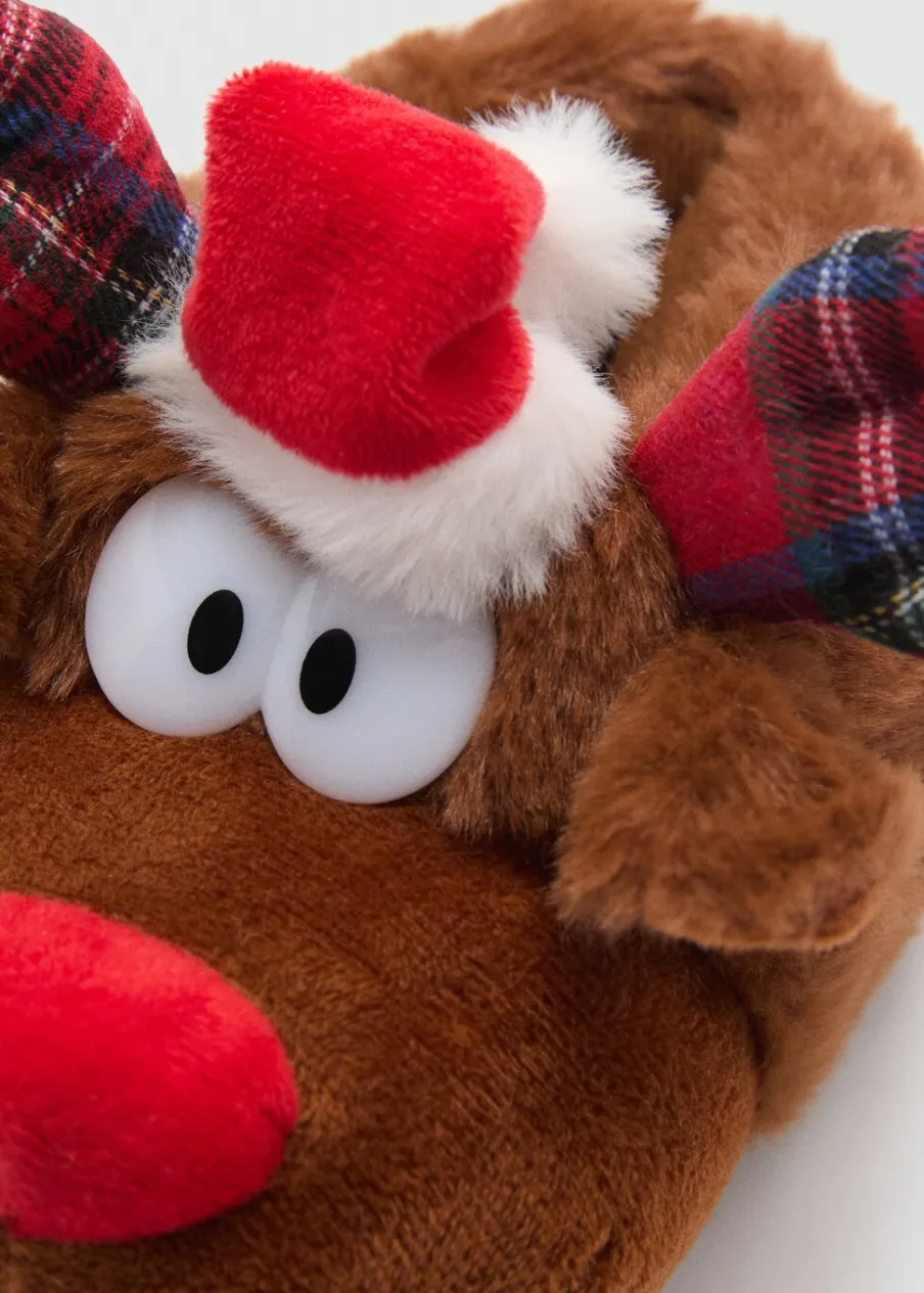OpisMotyw renifera. Włochata tekstura. Płaska podeszwa. Okrągły nosek. Kolekcja Bożonarodzeniowa.