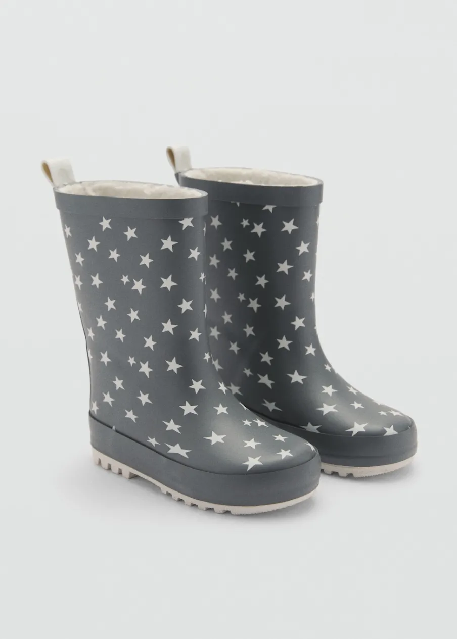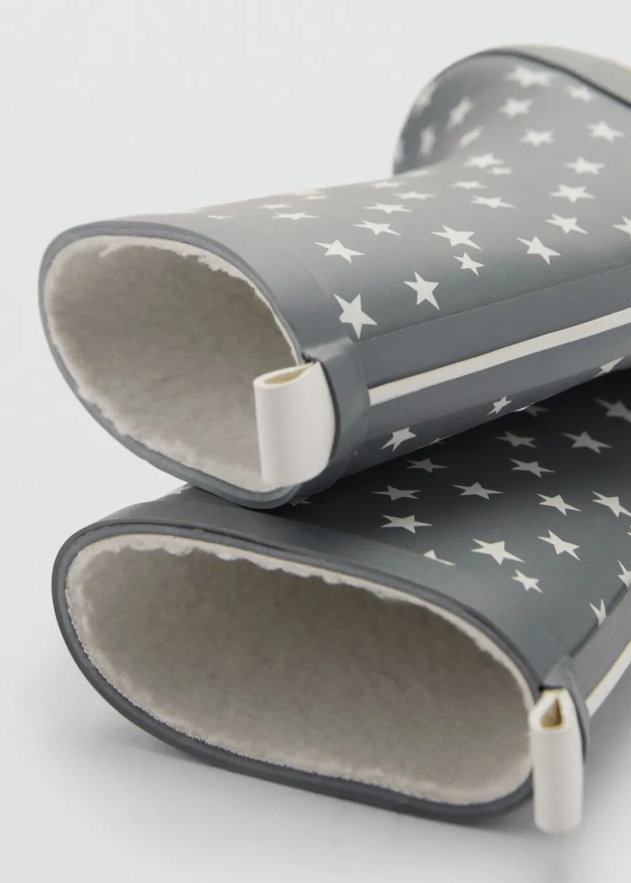 Wzór w gwiazdki. Futrzana podszewka z baranka. Okrągły nosek. Gumowa podeszwa. Uchwyt z tyłu.