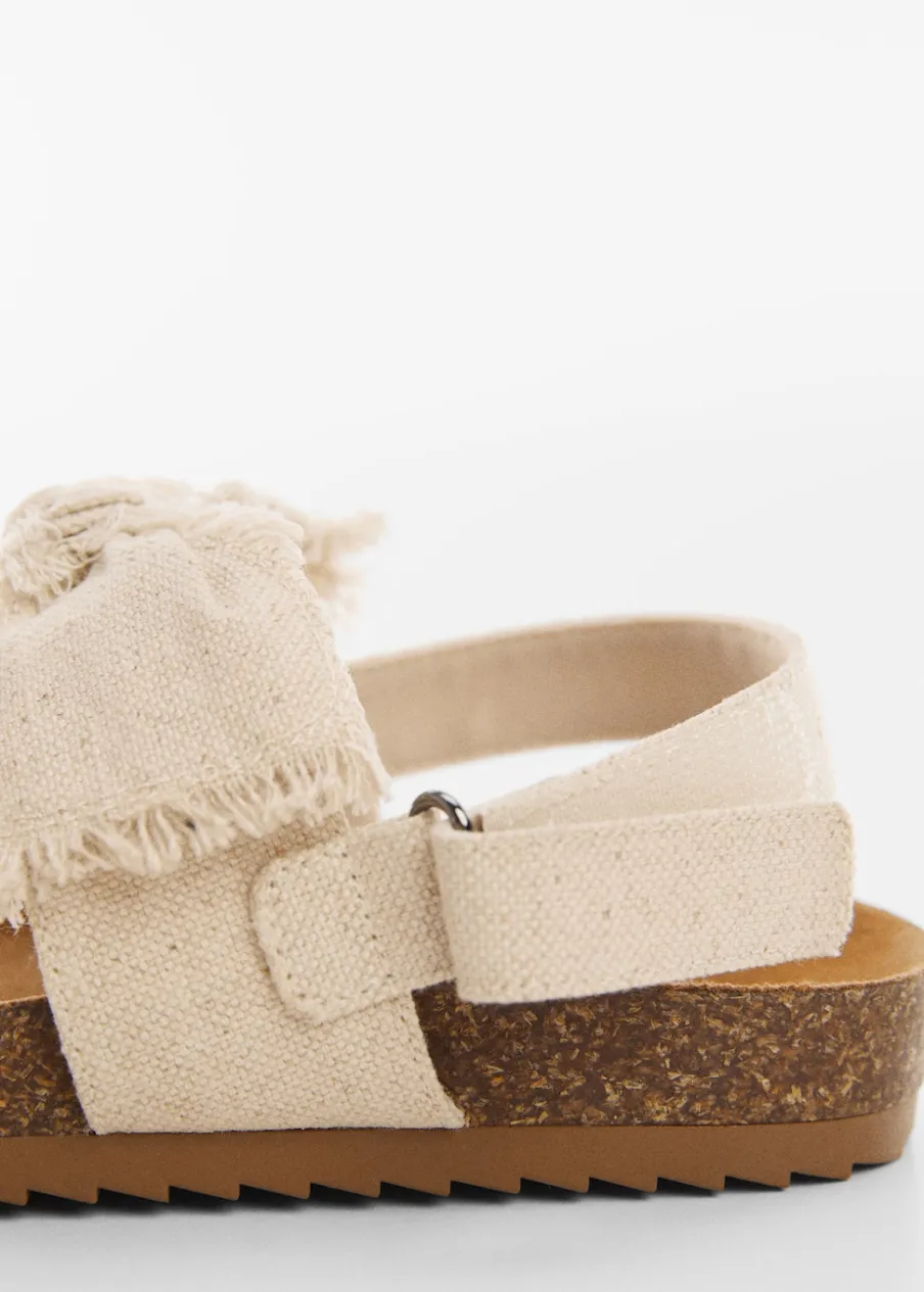 Tkanina kanwa. Rozporek z przodu. Płaska podeszwa. Wierzch z bawełny. Ozdobna kokardka. Okrągły nosek. Zapięcie na rzepy.
