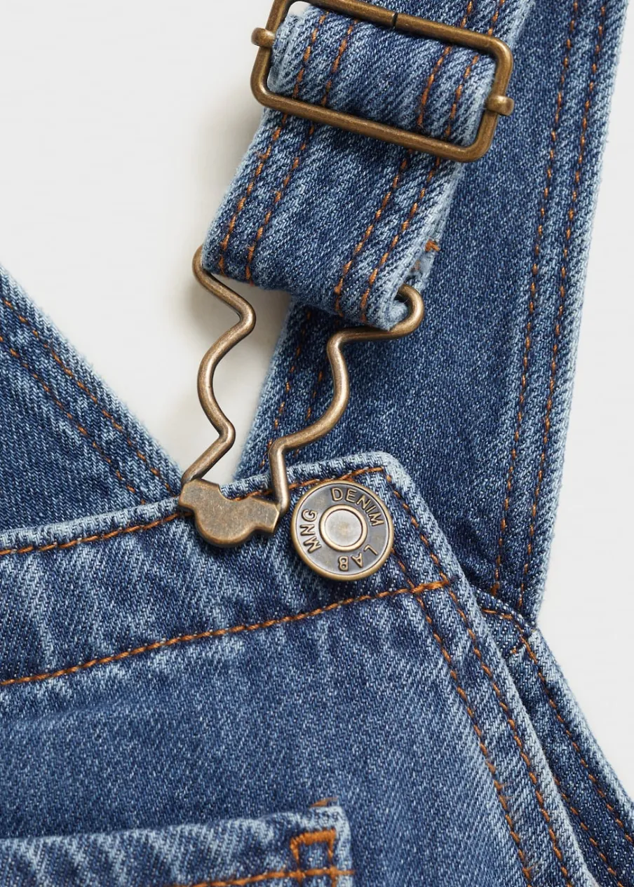 Model długi. Model prosty. Kwadratowy dekolt. Kieszeń nakładana. Regulowane ramiączka zapinane z tyłu na haftki. Pięć kieszeni. Wewnętrzna podszewka. Tkanina bawełniana w dżinsowym stylu.