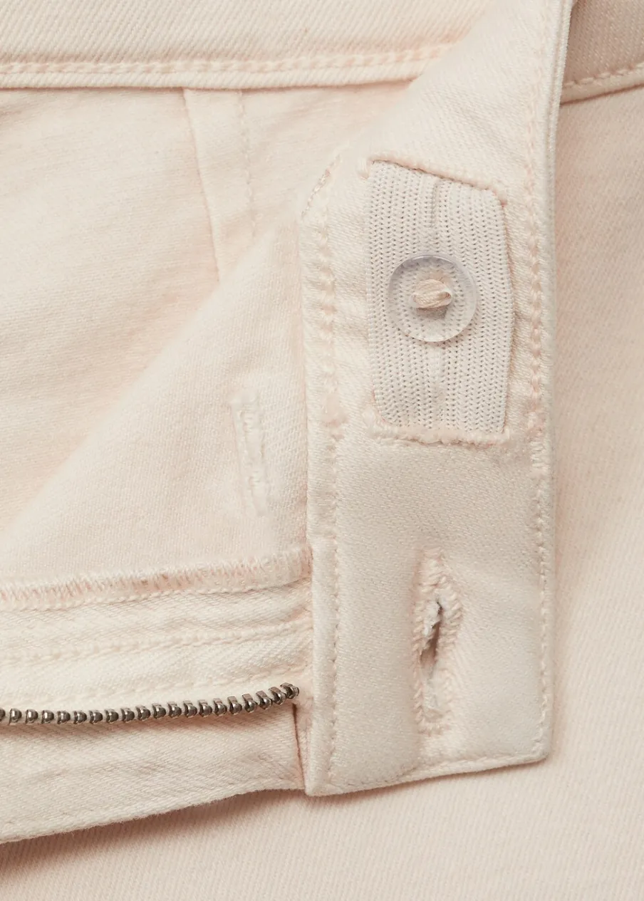 Tkanina bawełniana w dżinsowym stylu. Model prosty. Średni stan. Elastyczny, regulowany pas. Szlufki w pasie. Kieszenie nakładane z tyłu. Zapięcie na zamek i guzik z przodu.