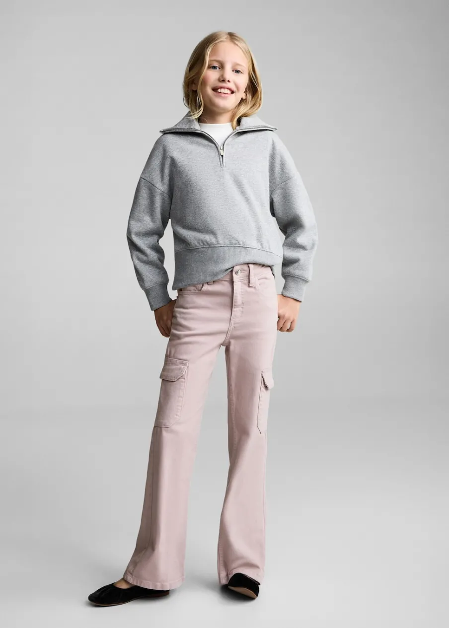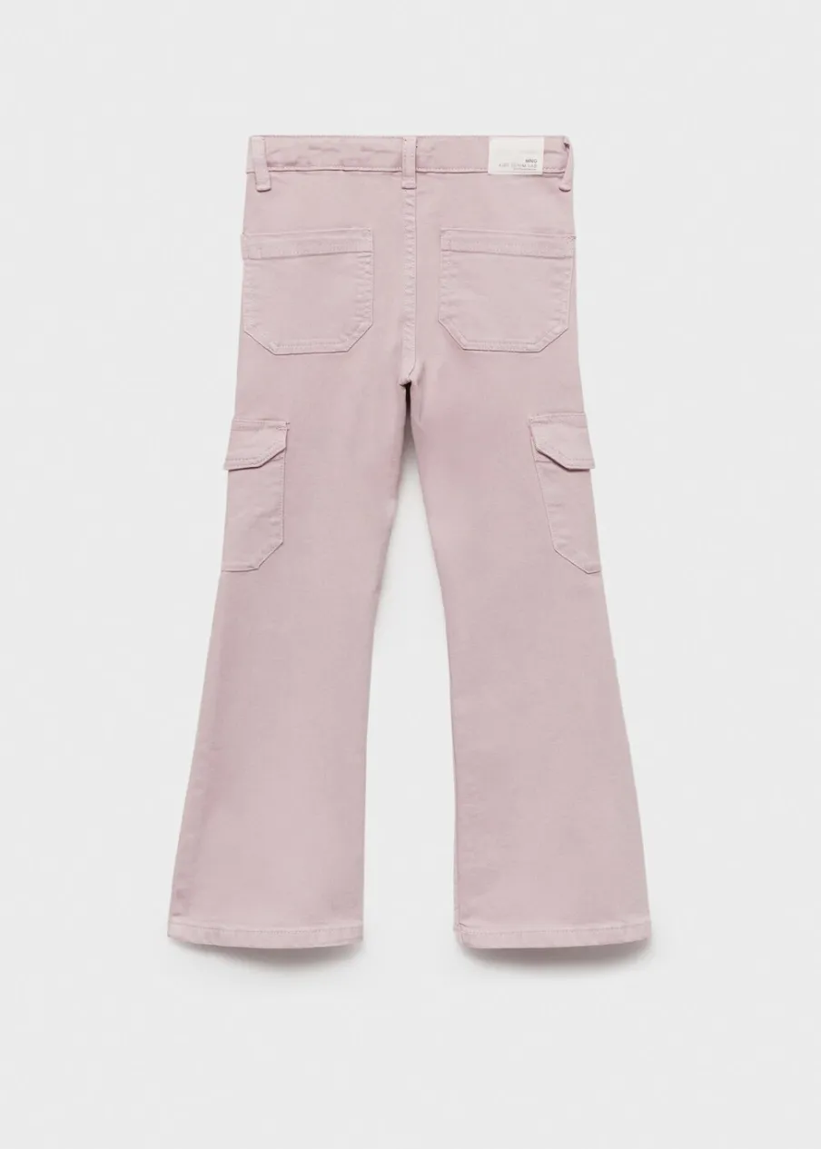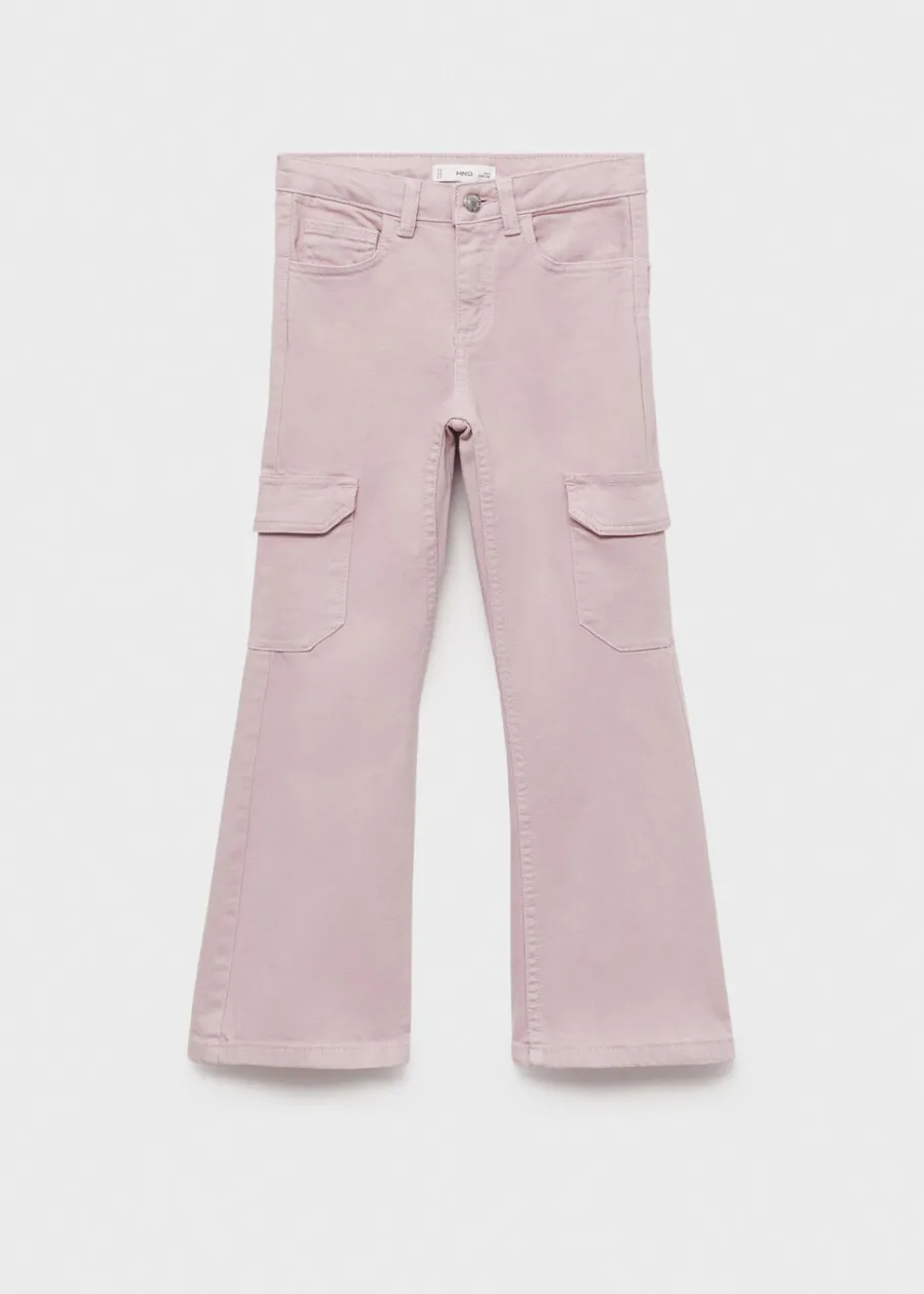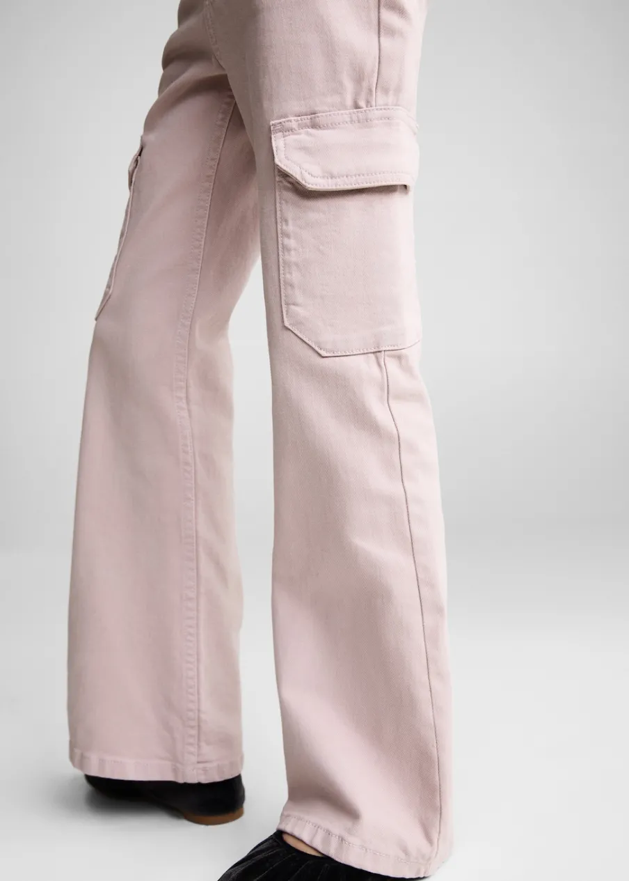 Tkanina bawełniana w dżinsowym stylu. Styl flare. Dwie kieszenie cargo. Kieszonka biletowa. Dwie kieszenie z przodu. Dwie kieszenie nakładane z tyłu. Szlufki. Zapięcie na suwak i guzik.
