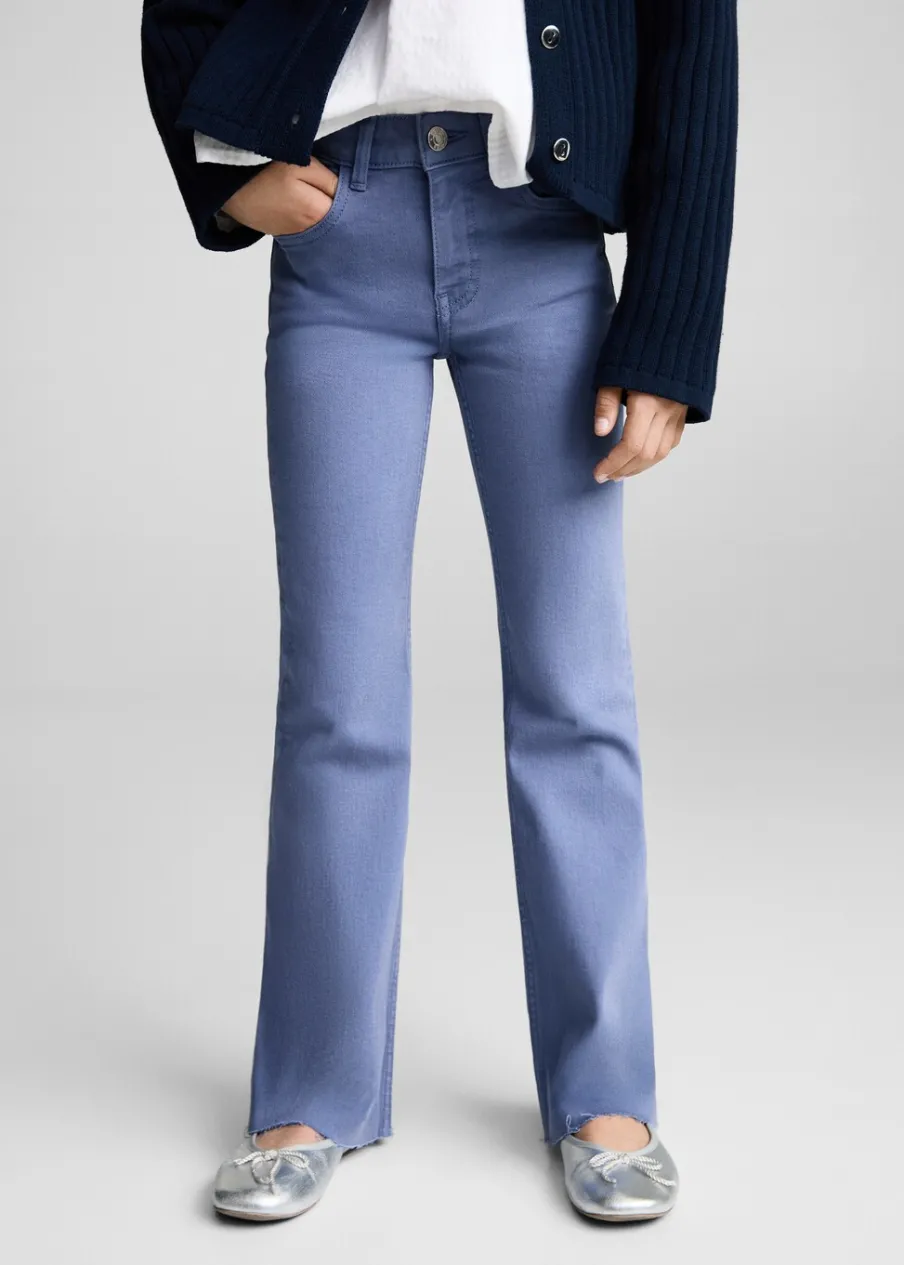 Tkanina bawełniana w dżinsowym stylu. Styl flare. Postrzępione nogawki. Model długi. Pięć kieszeni. Zapięcie na suwak i guzik. Kontrastowe szwy.