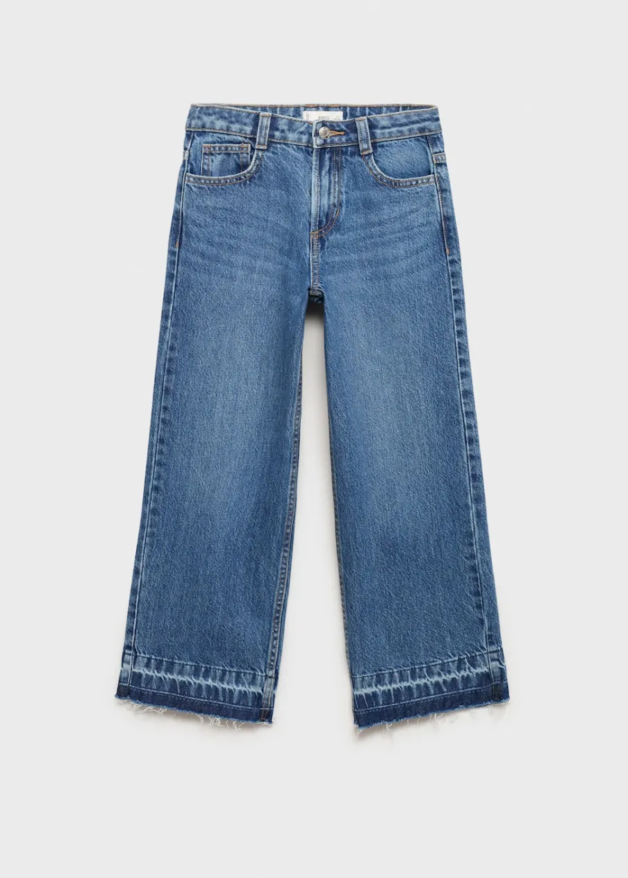 OpisTkanina bawełniana w dżinsowym stylu. Fason wideleg. Dekoracyjne szwy. Postrzępione nogawki. Pięć kieszeni. Zap…