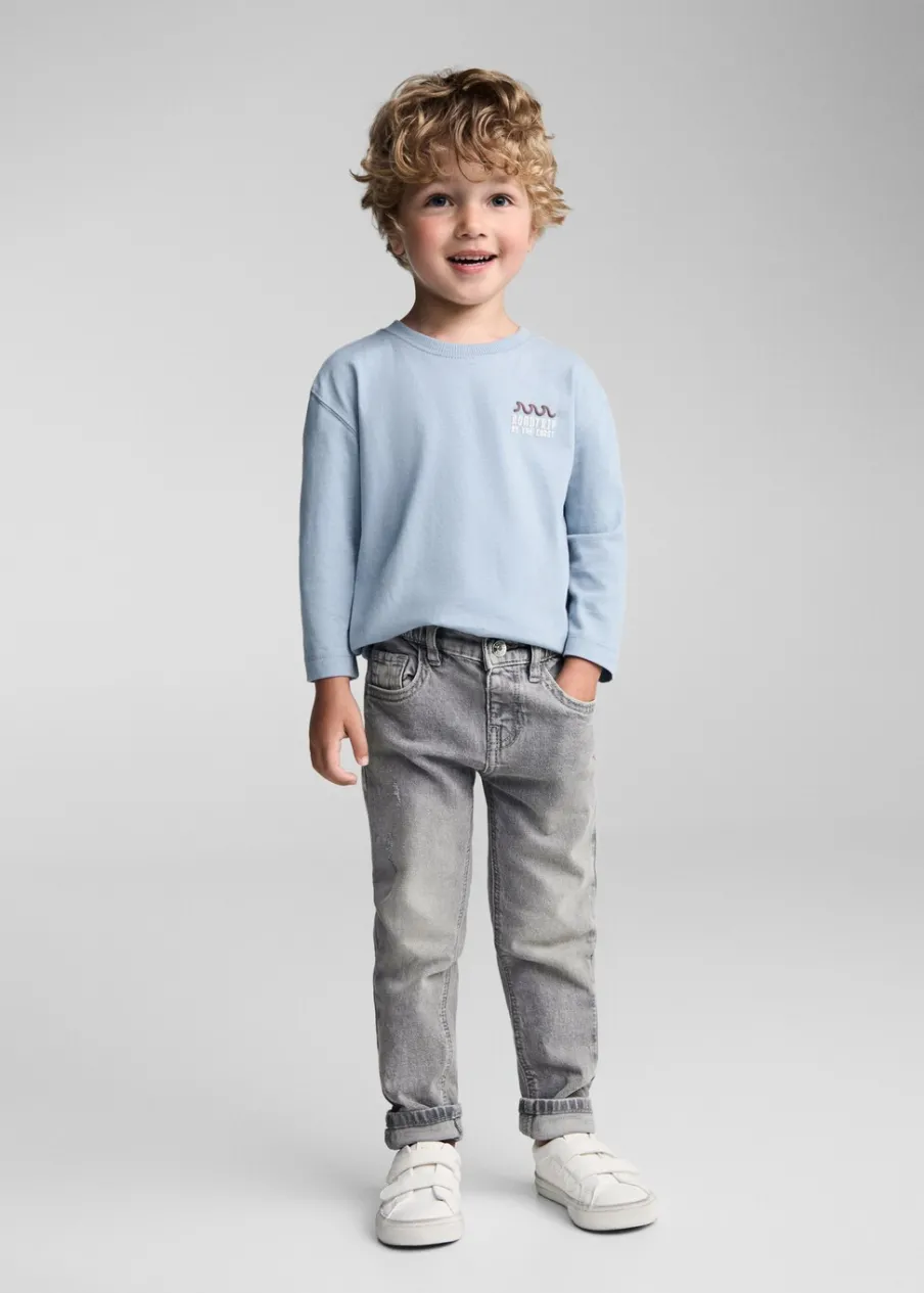 Tkanina bawełniana w dżinsowym stylu. Model prosty. Model długi. Elastyczny pas. Pięć kieszeni. Zapięcie na zatrzaskowy guzik.