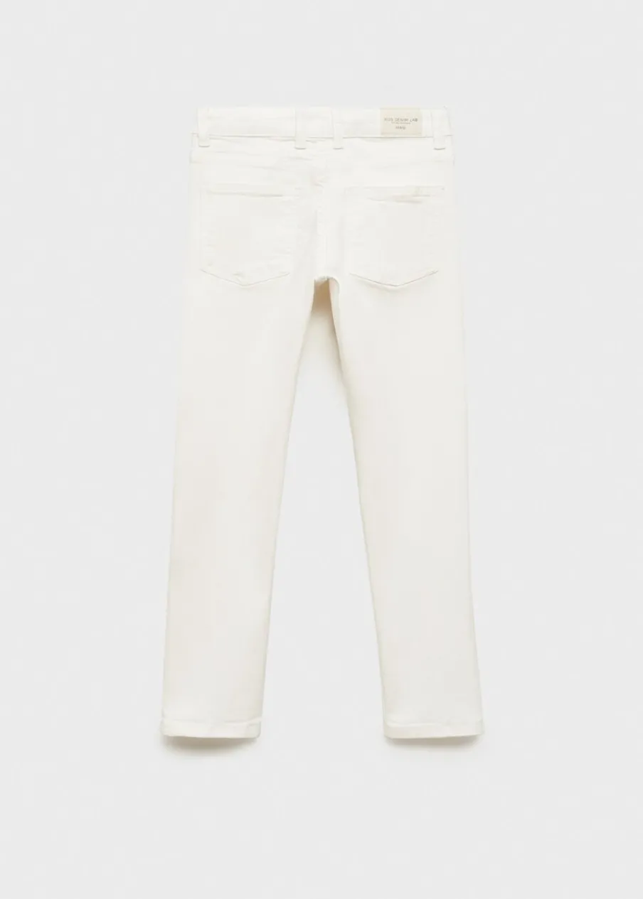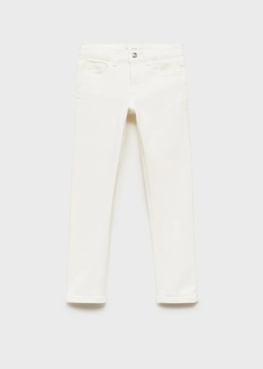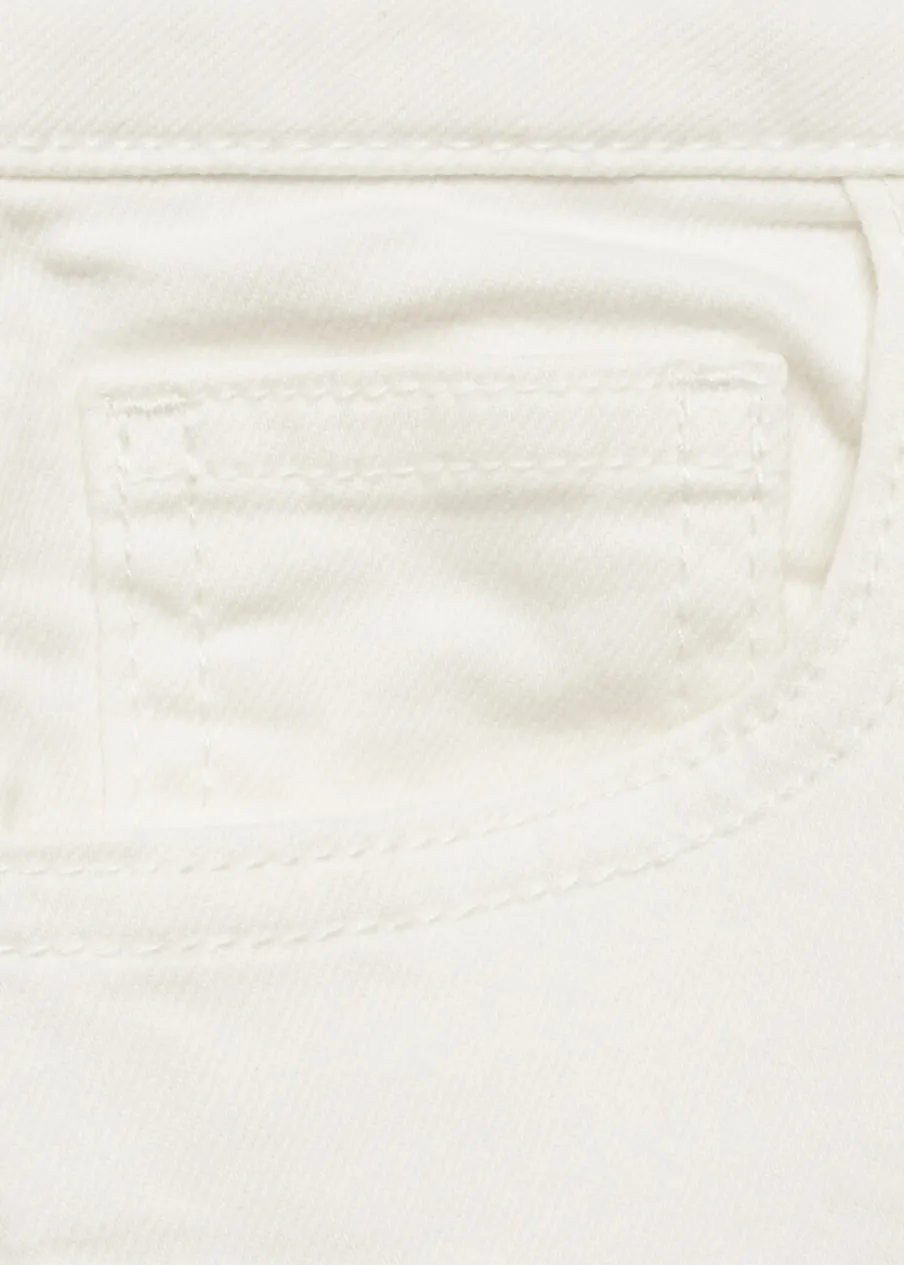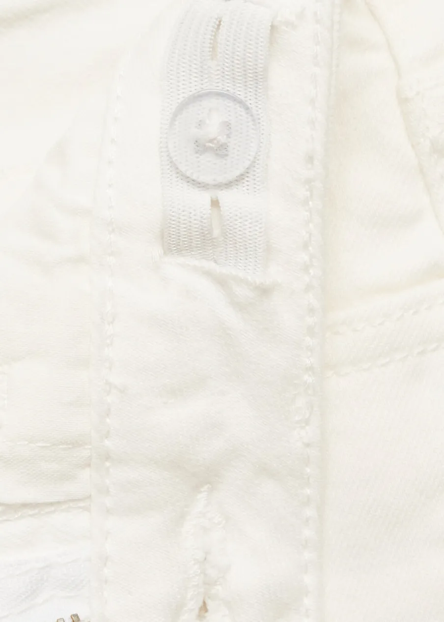 Tkanina bawełniana w dżinsowym stylu. Slim-fit. Szlufki. Regulowany pas z gumką i guzikiem. Pięć kieszeni. Zapięcie na suwak i guzik.