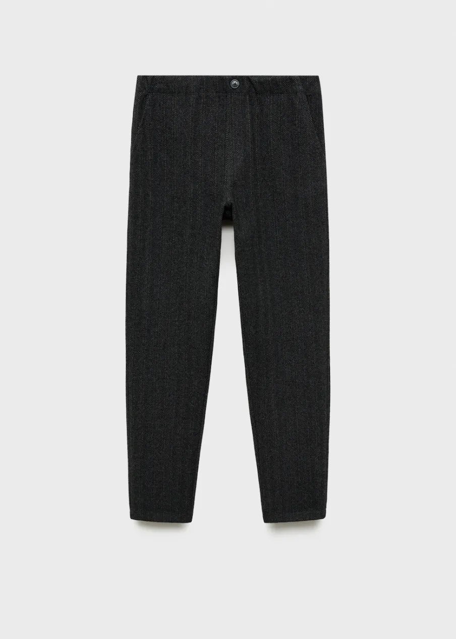 Model prosty. Model długi. Ozdobny guzik. Jodełkowy deseń. Dwie kieszenie boczne. Nakładana kieszeń z tyłu. Elastyczny pas.