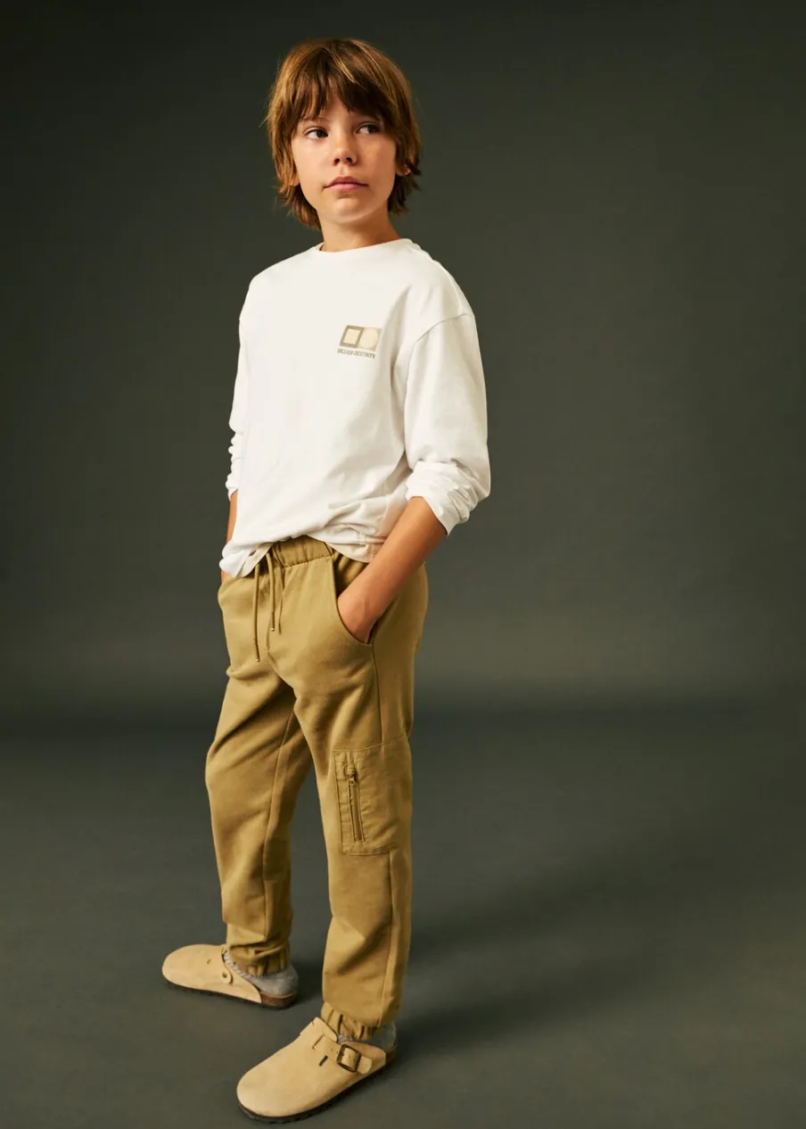 Fason jogger. Bawełna 100%. Elastyczny pas ze sznurkiem. Dwie kieszenie boczne. Kieszeń zapinana na suwak. Tylna kieszeń z patką. Powrót do szkoły.