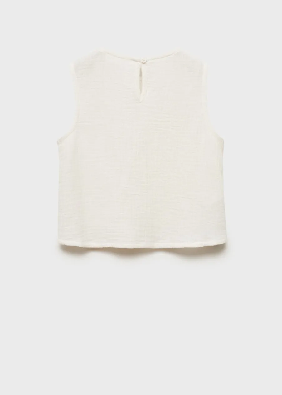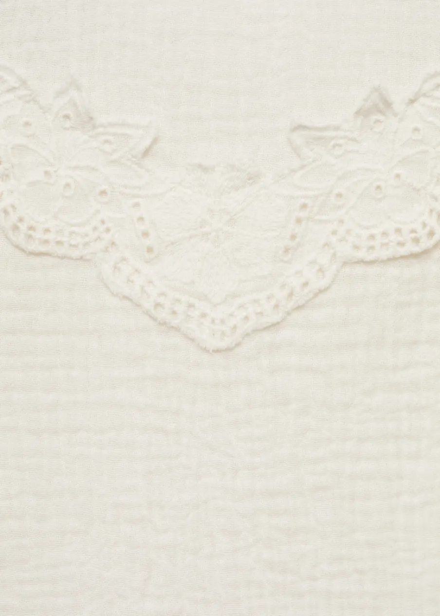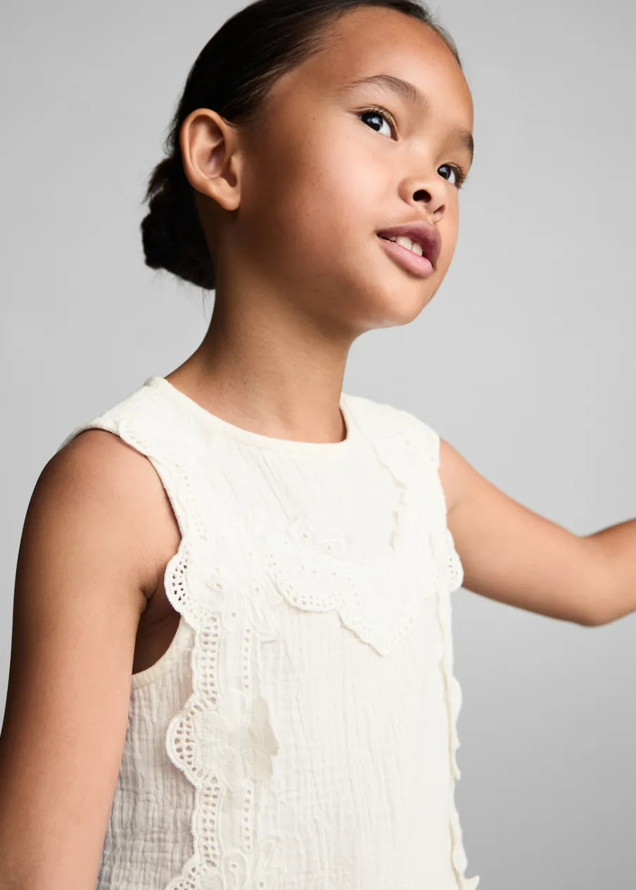 100% bomull. Model prosty. Kwiatowy haft. Okrągły dekolt. Bez rękawów. Zapięcie na guzik z tyłu. Haftowany motyw.