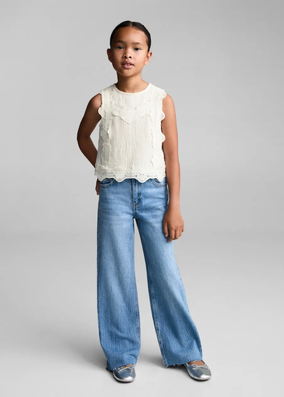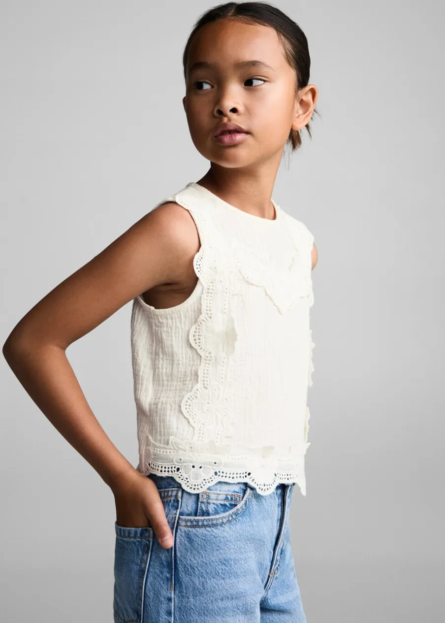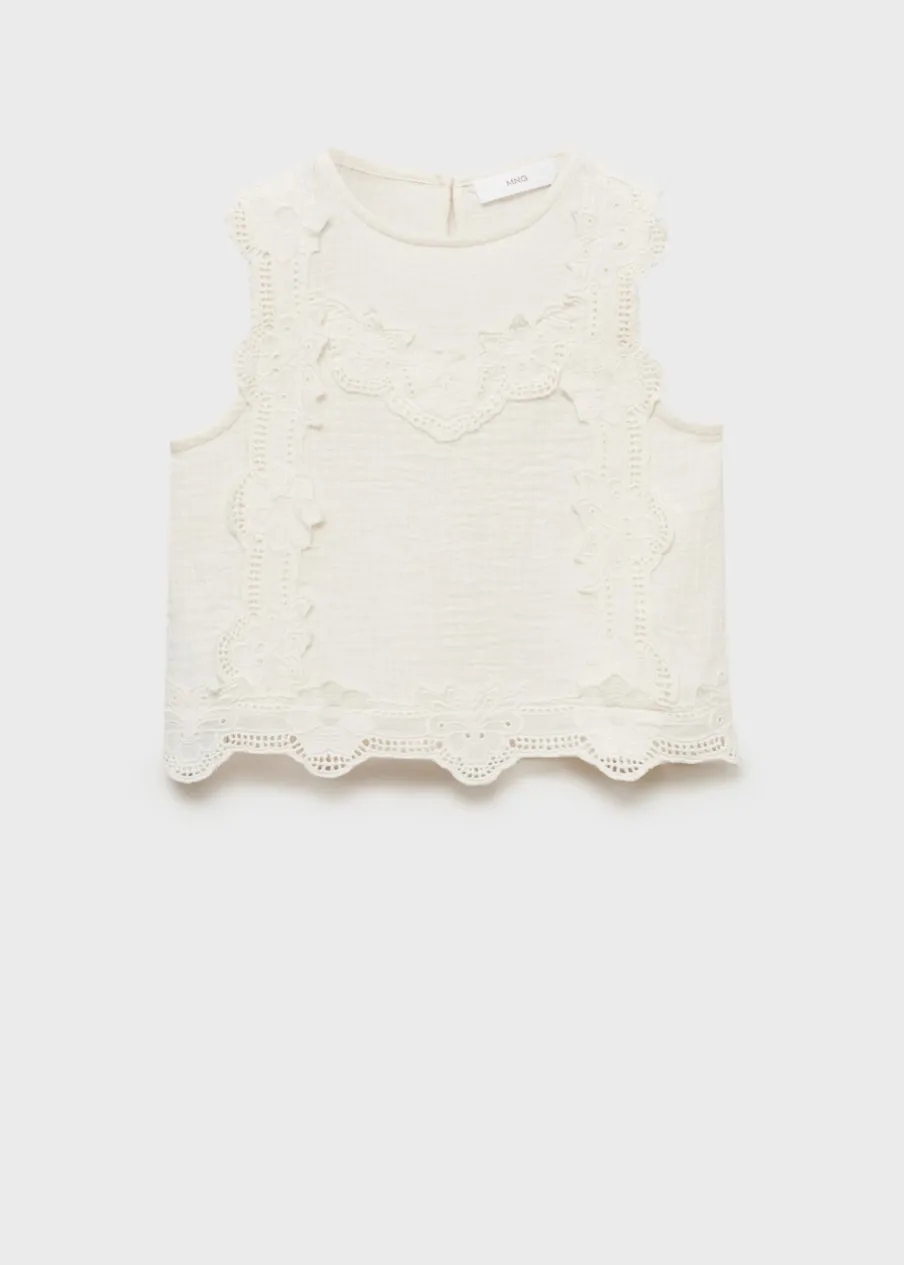 100% bomull. Model prosty. Kwiatowy haft. Okrągły dekolt. Bez rękawów. Zapięcie na guzik z tyłu. Haftowany motyw.