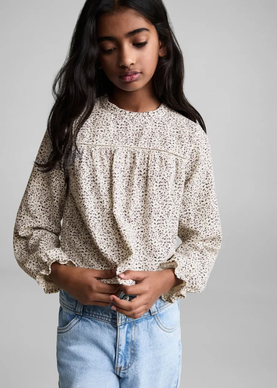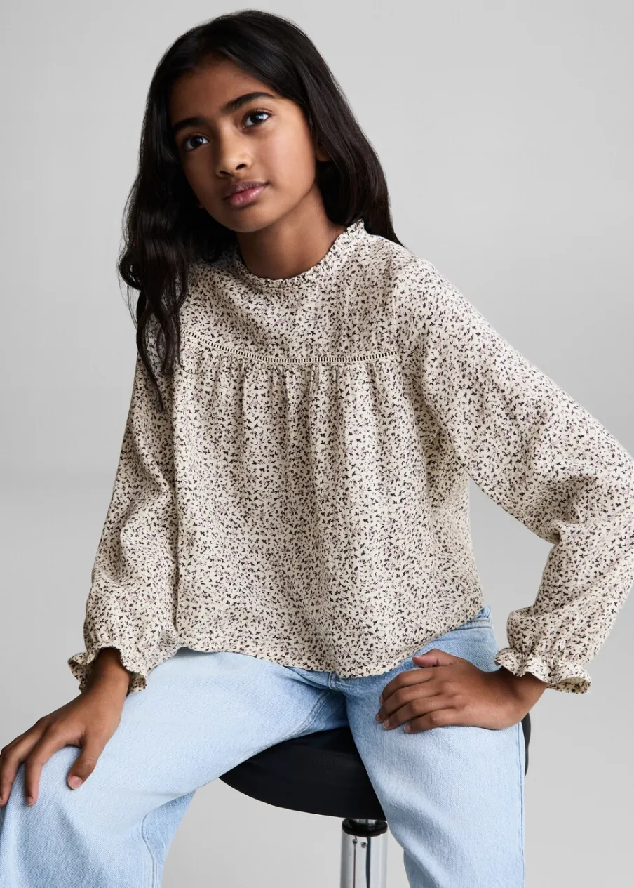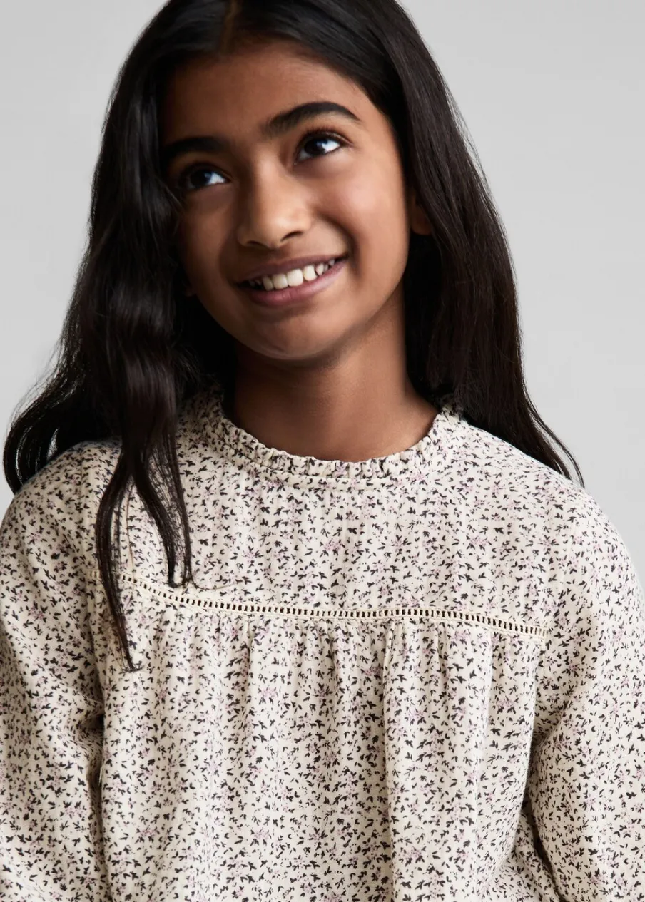 100% bomull. Kwiatowy wzór. Model prosty. Okrągły dekolt. Długi rękaw ze szczypankami. Zapięcie na guziki.