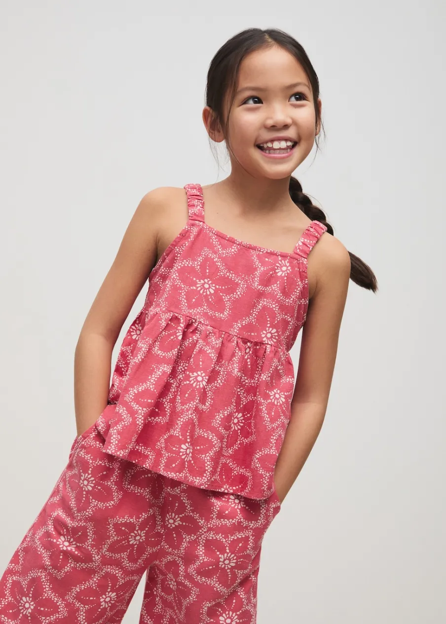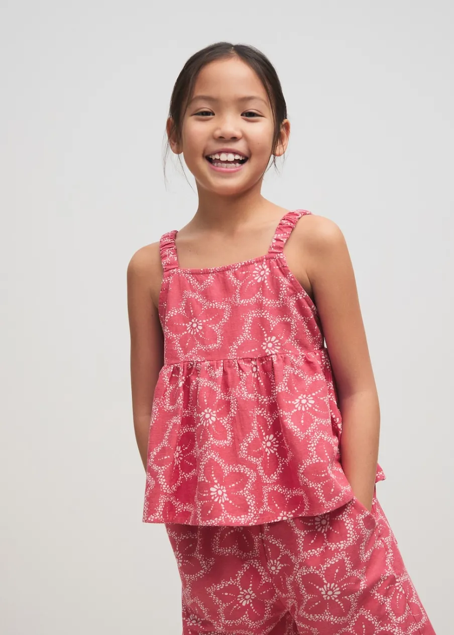 OpisTkanina z domieszką lnu. Kwiatowy wzór. Marszczone ramiączka. Detal z rozcięciem z tyłu. Total look.