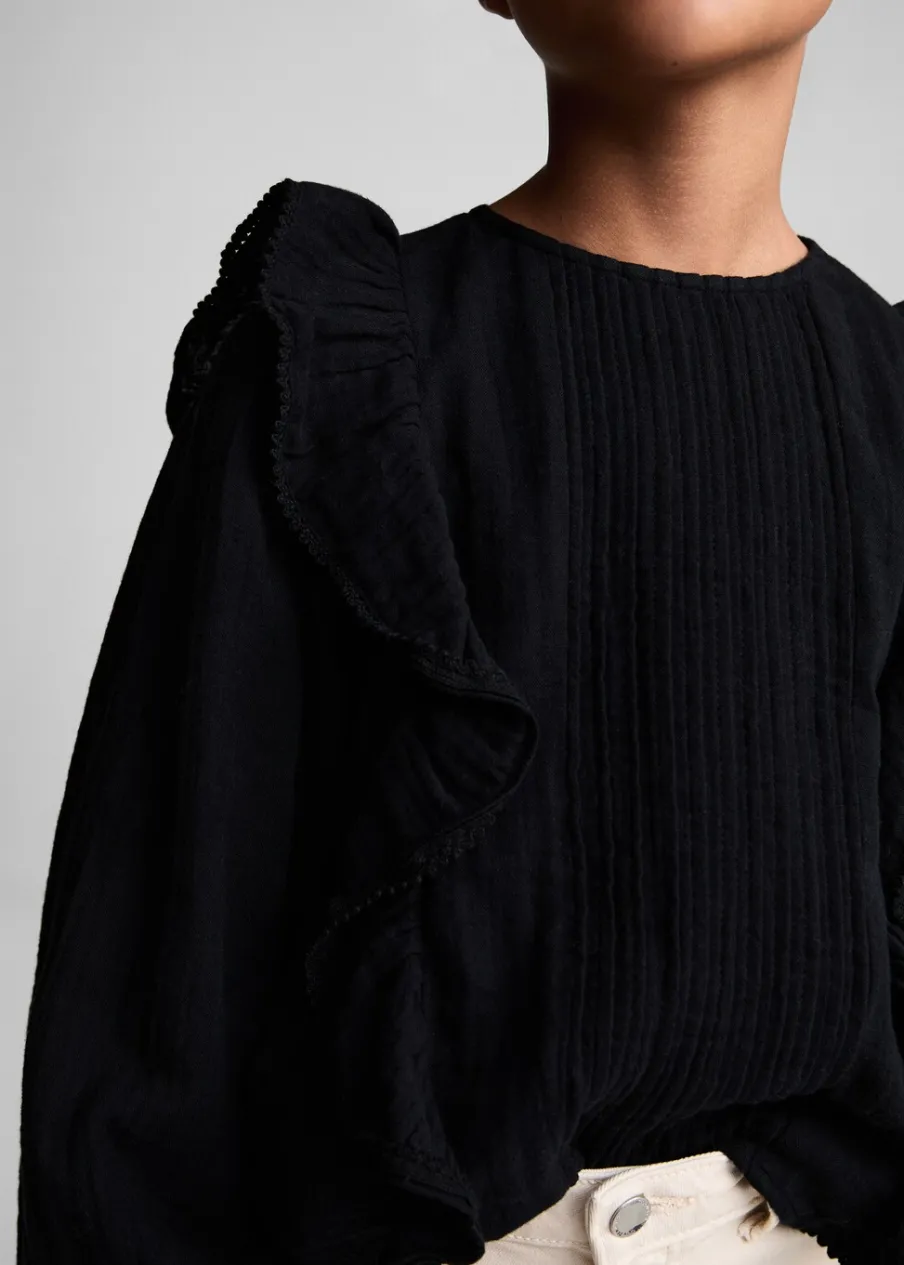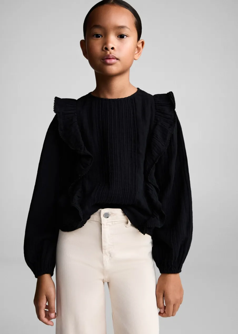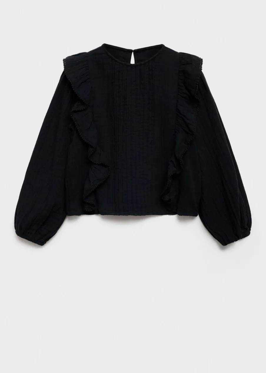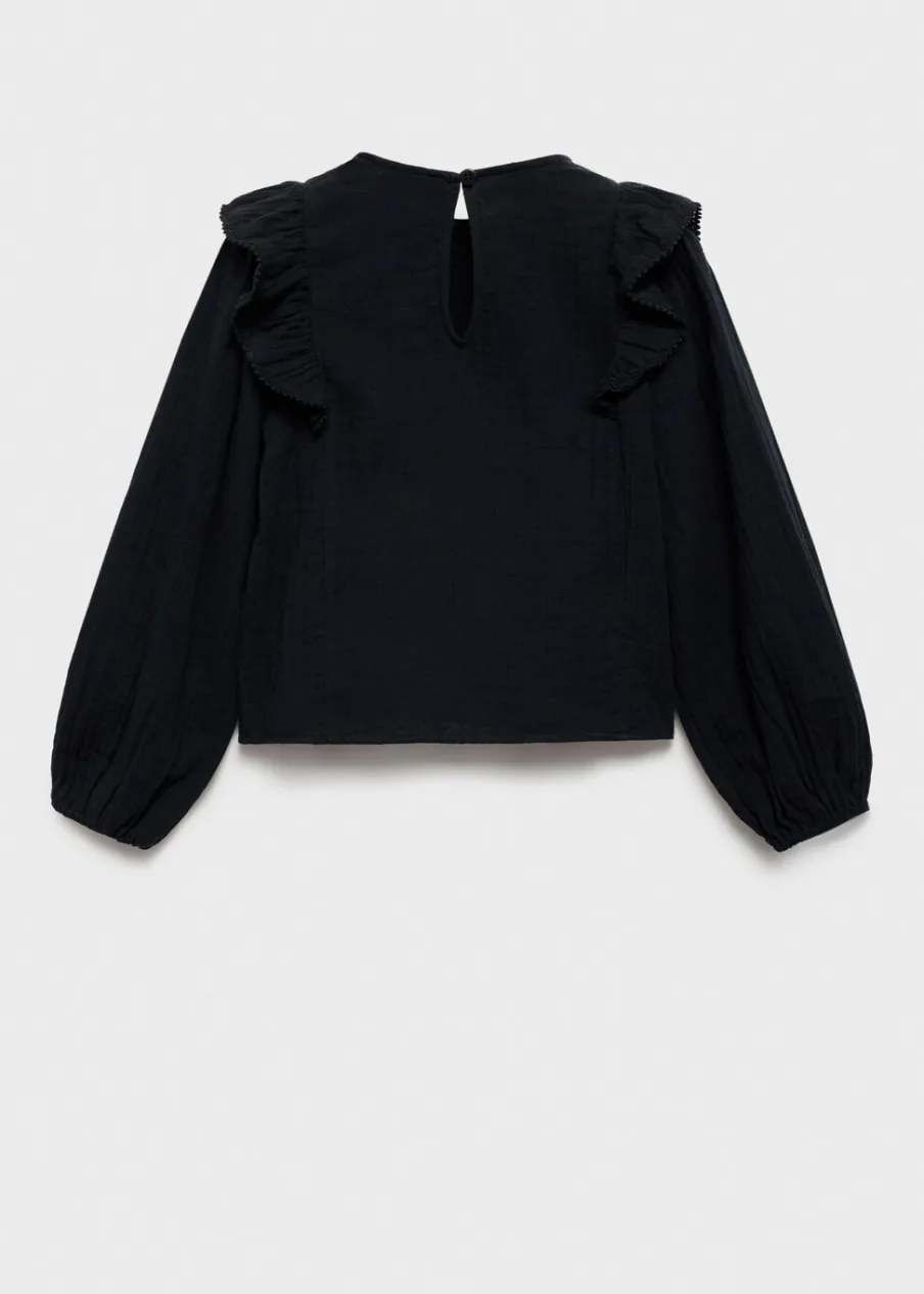 Kolekcja Powrót do szkoły. Bawełna 100%. Model prosty. Okrągły dekolt. Ozdobne marszczenie. Długi bufiasty rękaw. Ozdobne falbany. Haftowane detale. Zapięcie na guzik z tyłu.