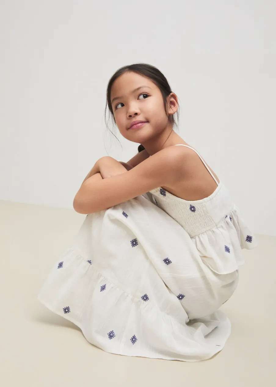 Tkanina z 100% bawełny. Marszczony panel ze ściegiem typu plaster miodu. Haftowane detale. Cienkie ramiączka. Falbana u dołu. Total look.