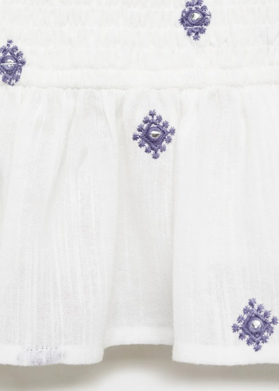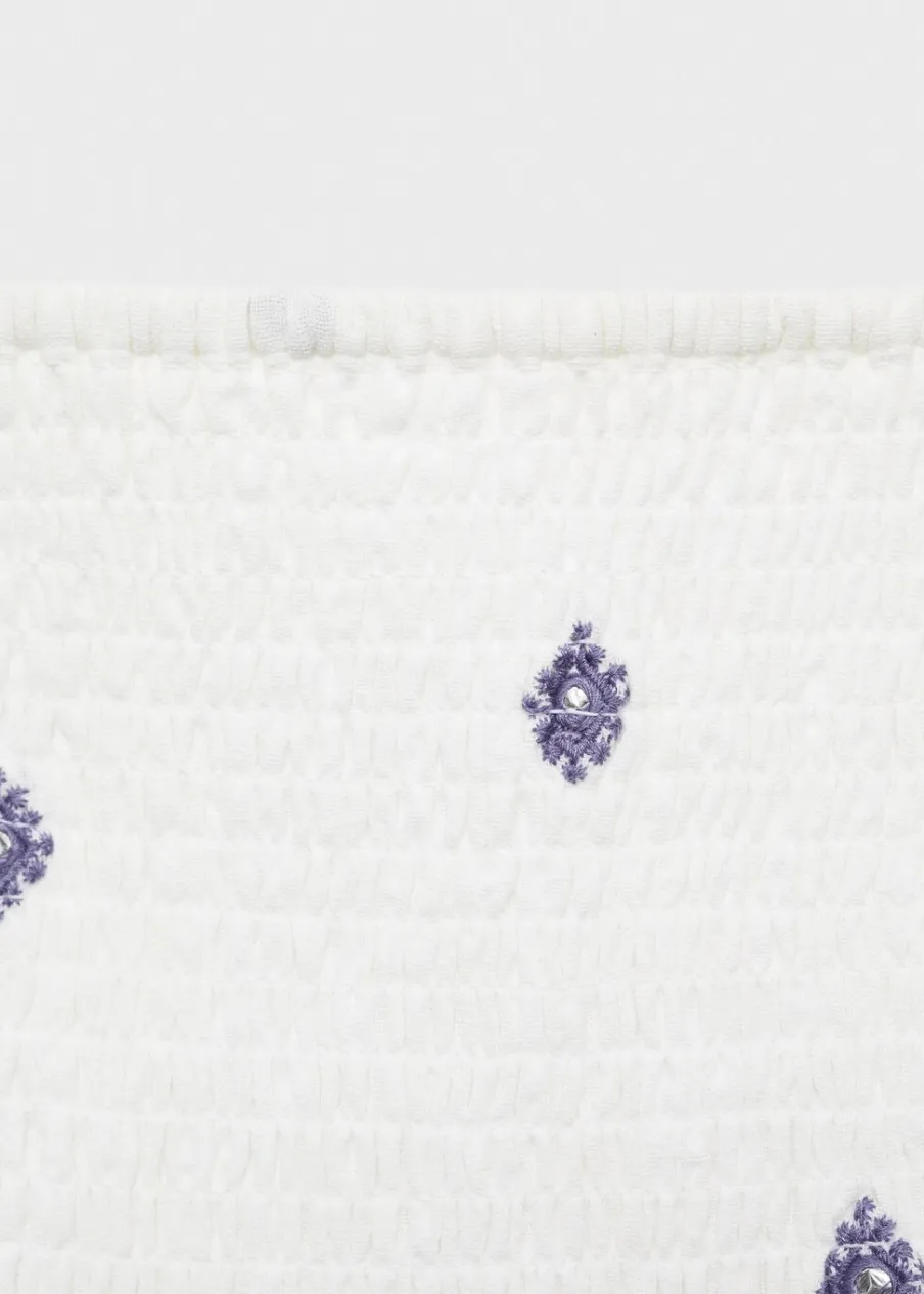 OpisTkanina z 100% bawełny. Marszczony panel ze ściegiem typu plaster miodu. Haftowane detale. Cienkie ramiączka. Fal…