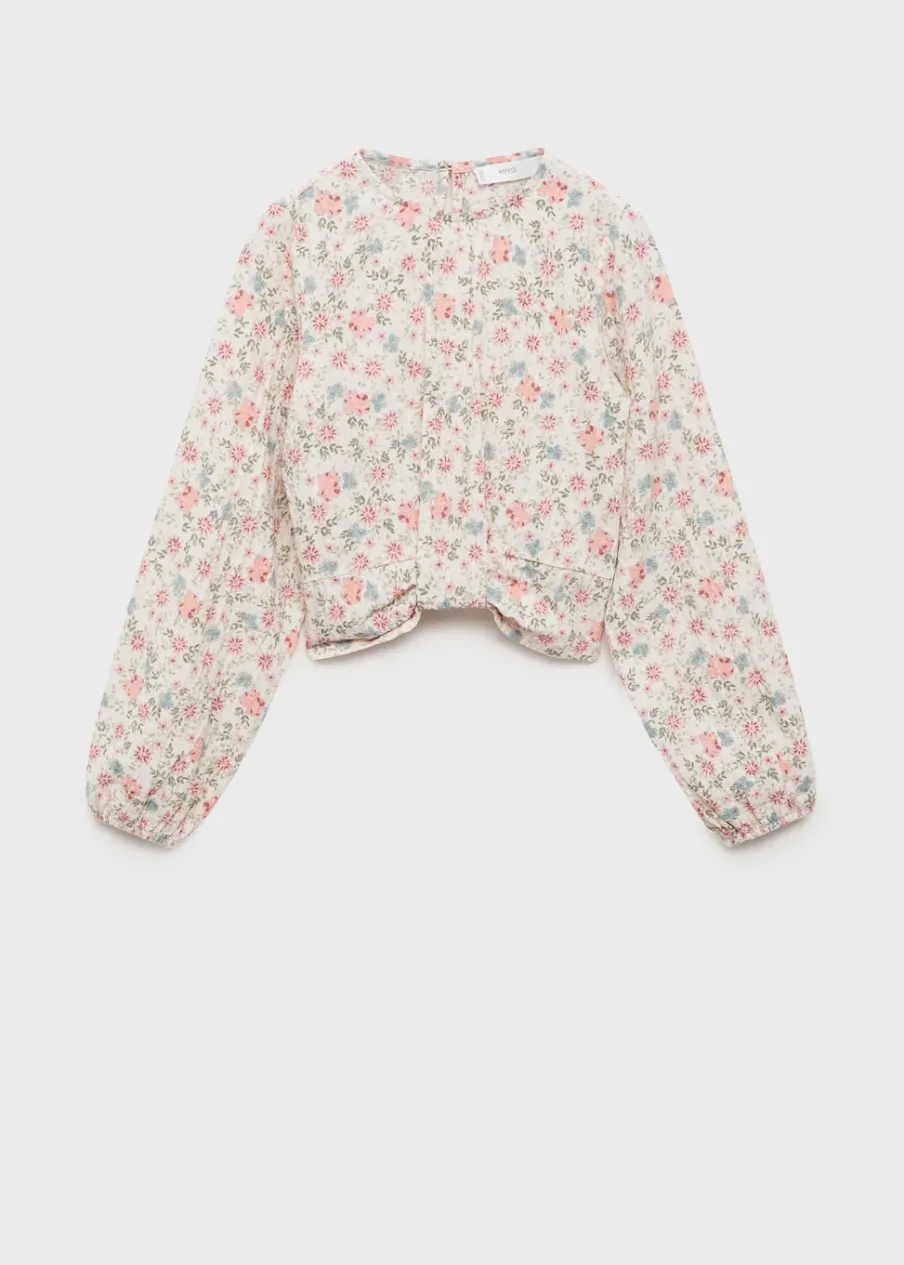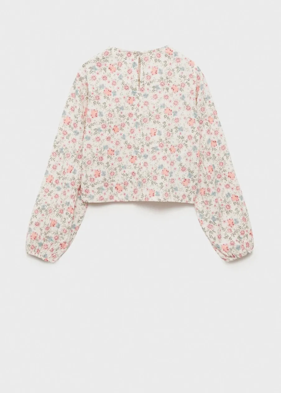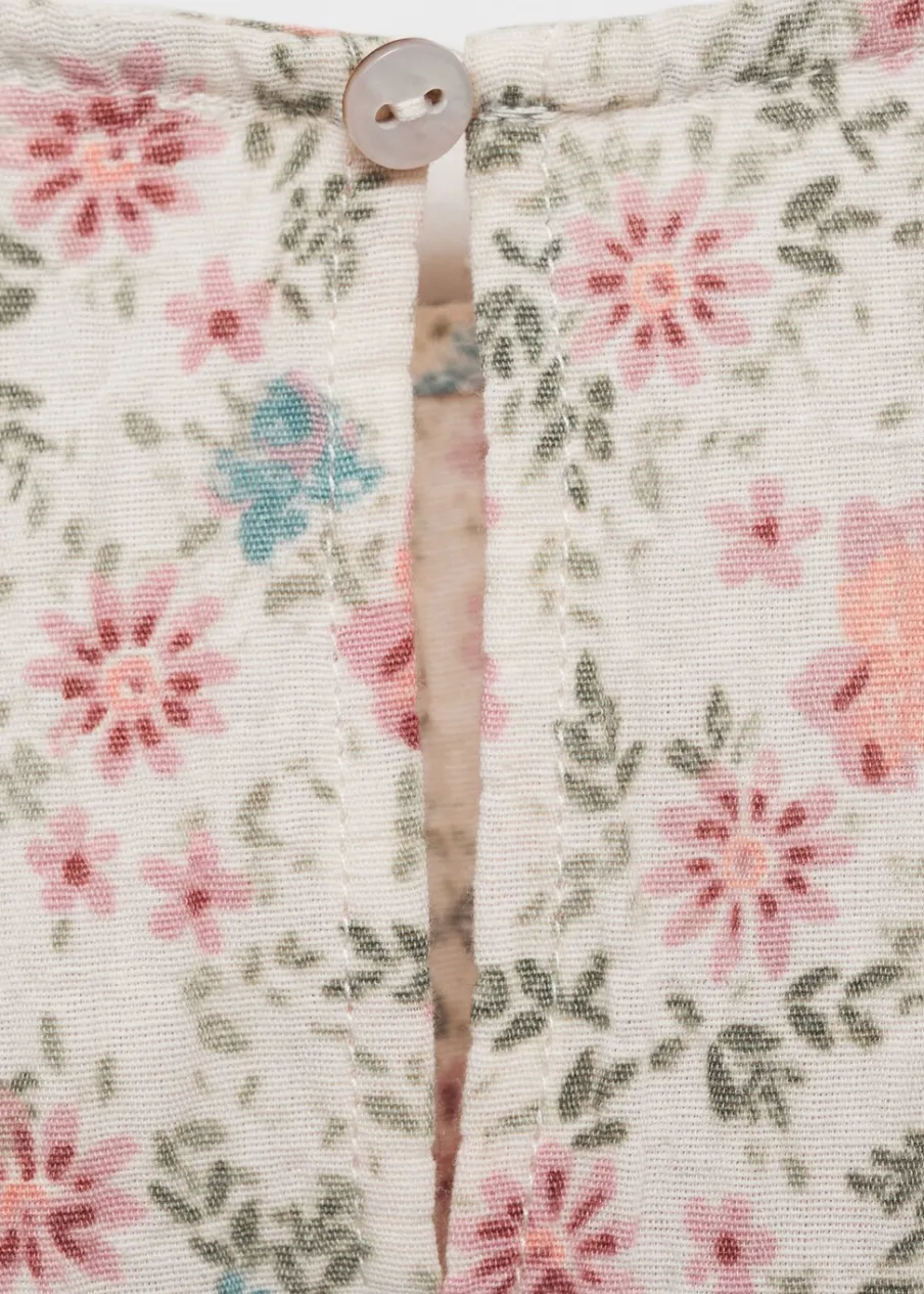 OpisBawełniana tkanina. Wzór w kwiaty. Długi rękaw. Okrągły dekolt z zapięciem na guzik. Mankiet z gumką. Doszyw…