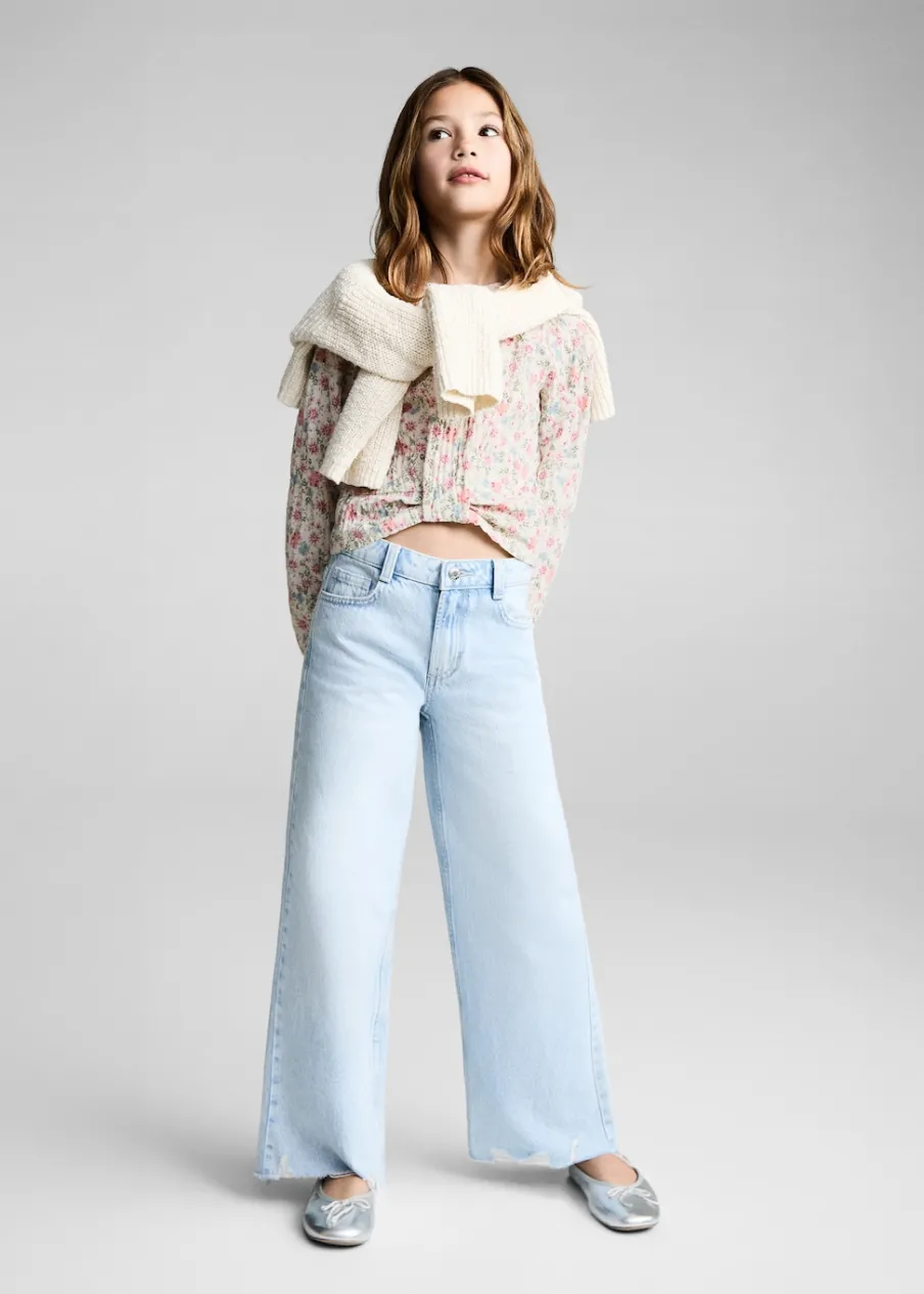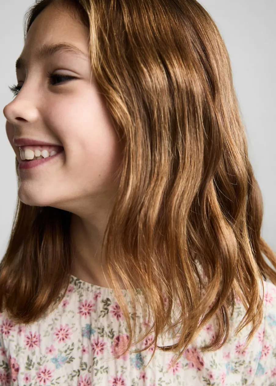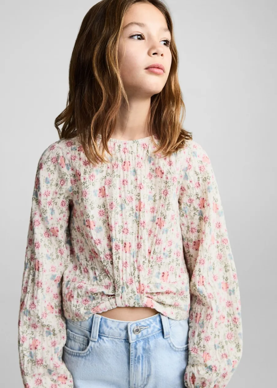 OpisBawełniana tkanina. Wzór w kwiaty. Długi rękaw. Okrągły dekolt z zapięciem na guzik. Mankiet z gumką. Doszyw…