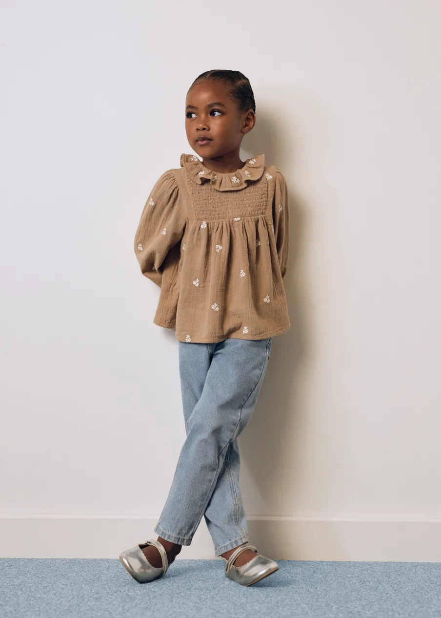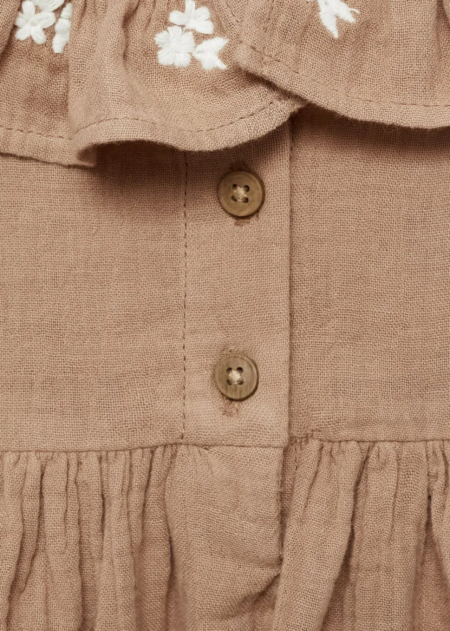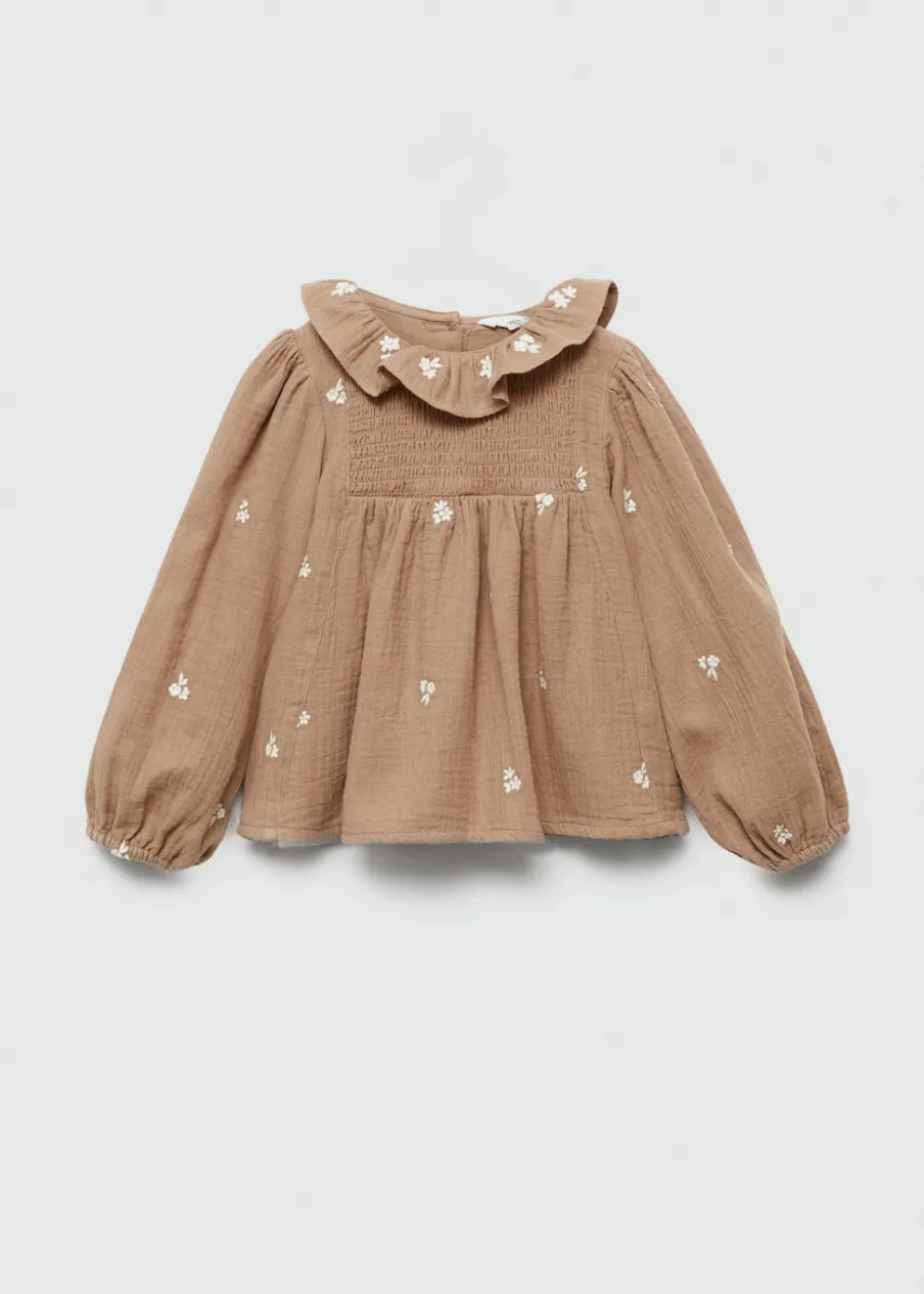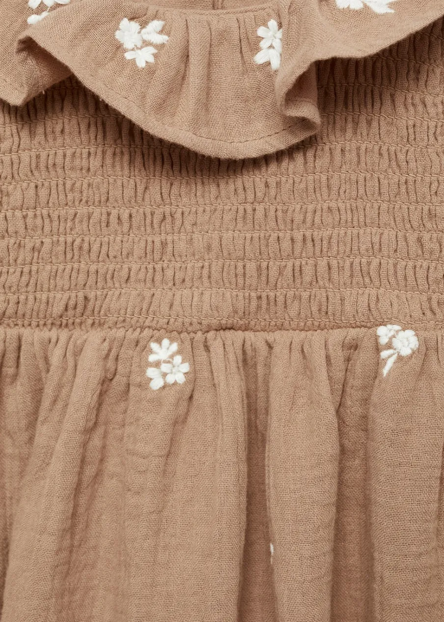 Zapięcie z tyłu. Długi rękaw. Falbanki pod szyją. Okrągły dekolt. Zapięcie z tyłu na guziki. 100% bomull. Kreszowana tkanina. Kwiatowy haft.