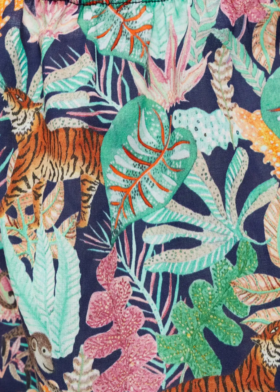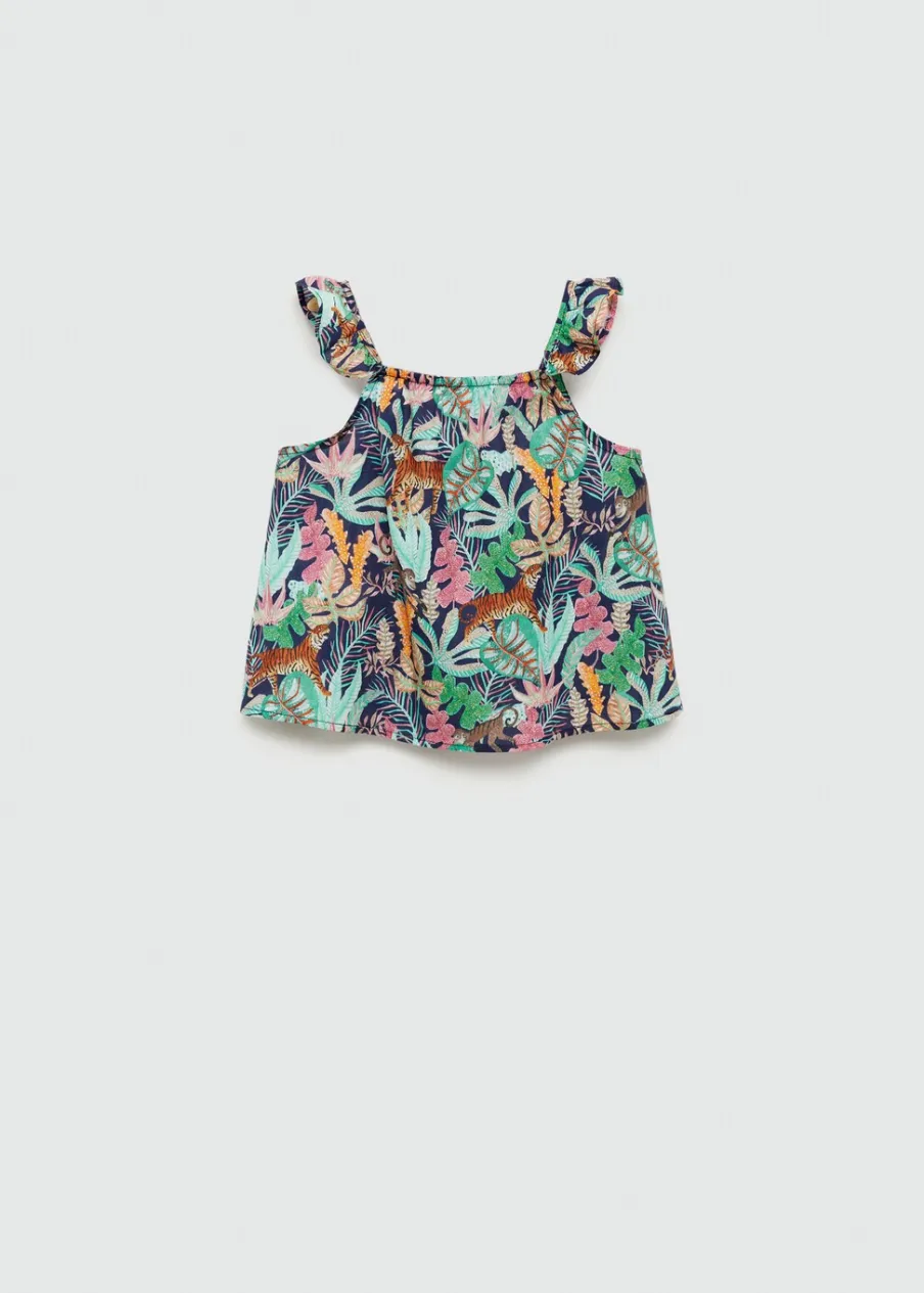 Opis100% bomull. Tropikalny wzór. Model prosty. Ramiączka z falbaną. Kwadratowy dekolt.
