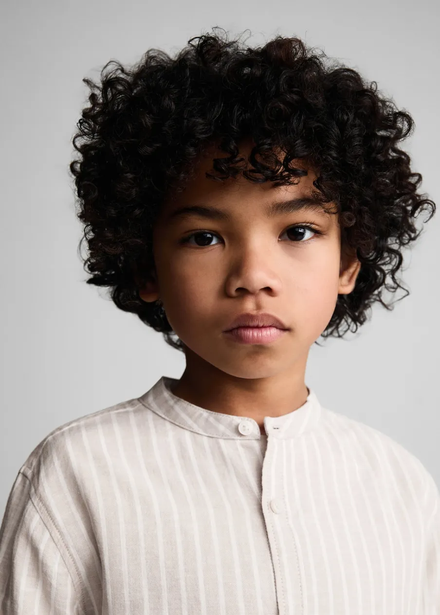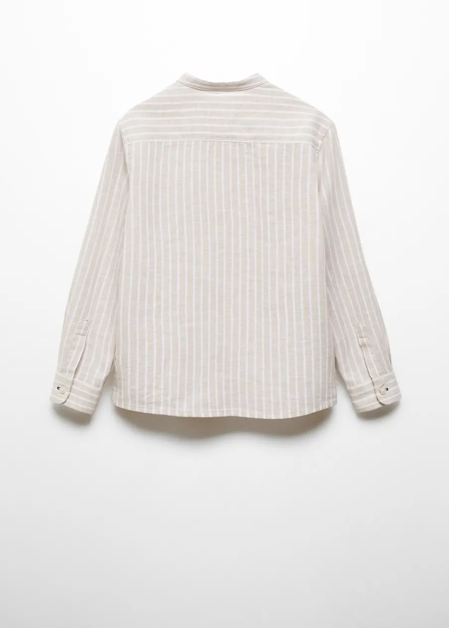 Tkanina mieszanka bawełny i lnu. Wzór w pasy. Krój regular. Zapinane mankiety. Stójkowy kołnierzyk. Długi rękaw. Zapięcie na guziki.