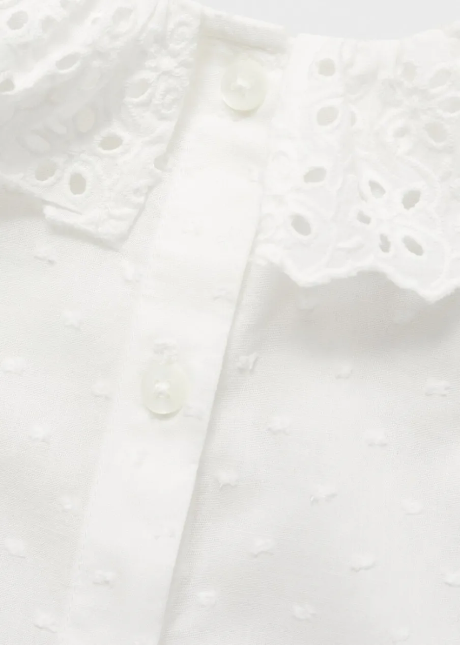 Tkanina z bawełną. Model prosty. Kołnierzyk bebe. Haftowane detale. Długi rękaw. Zapięcie z tyłu na guziki.