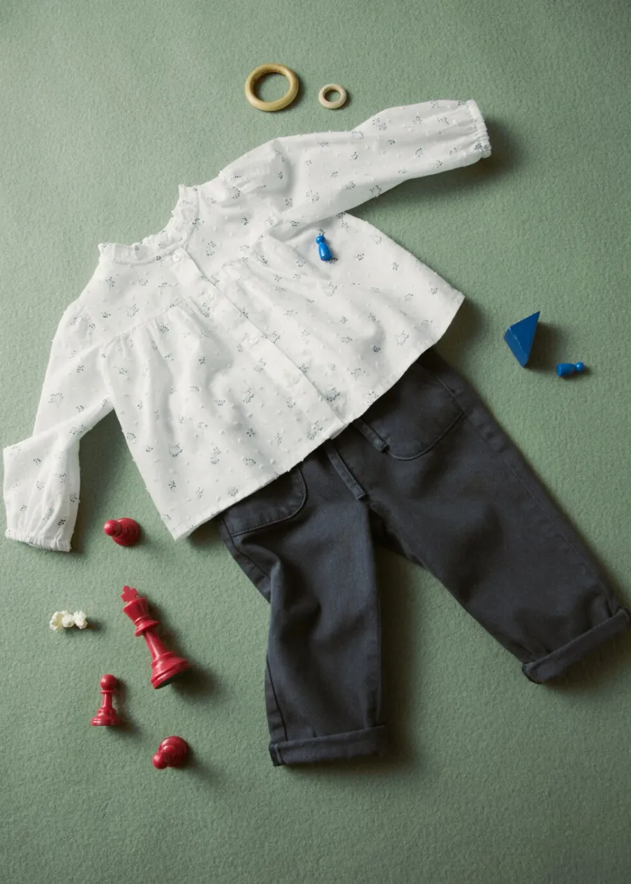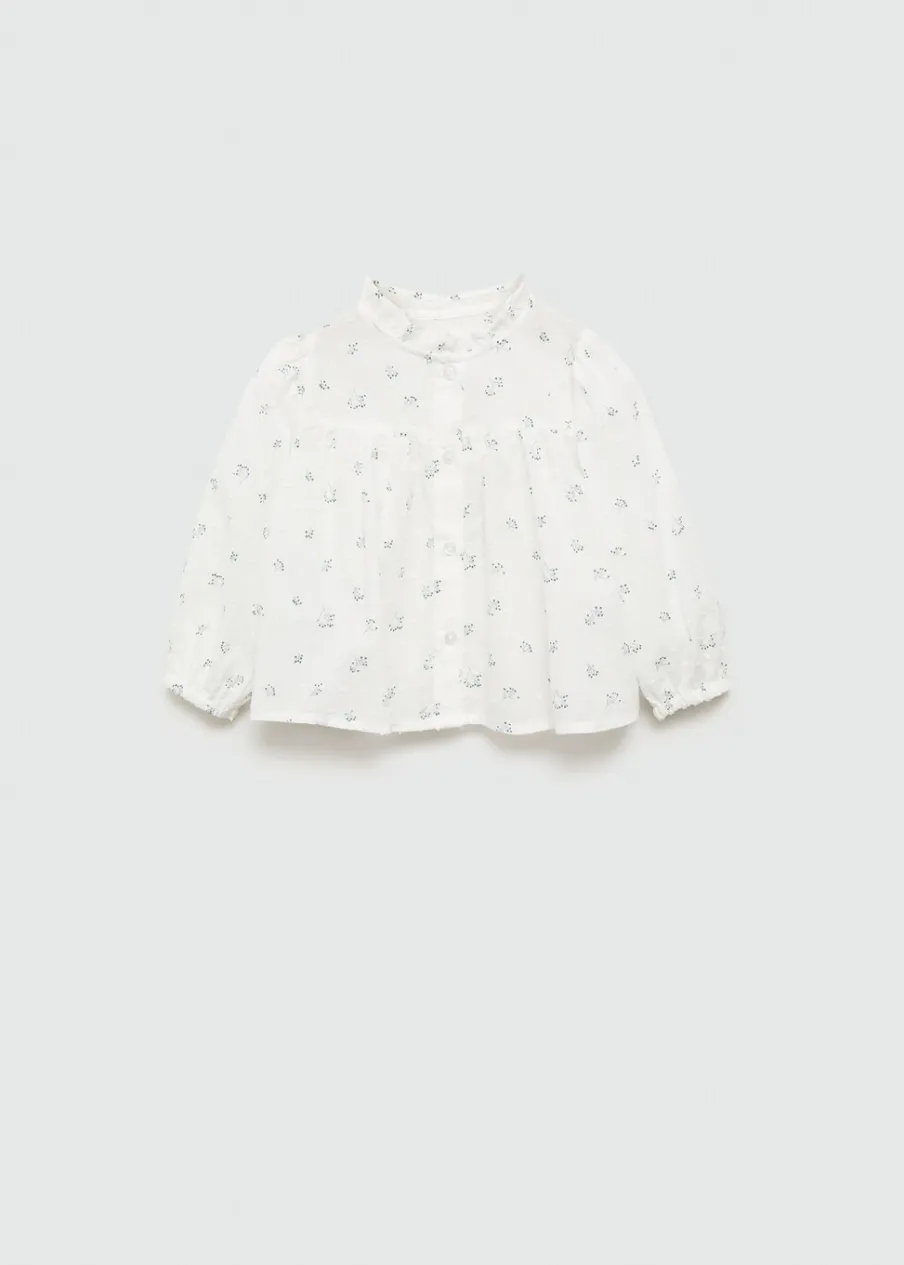 Bawełna 100%. Model prosty. Kwiatowy wzór. Falbanki pod szyją. Długi bufiasty rękaw. Zapięcie na guziki. Dostępny zestaw total look.