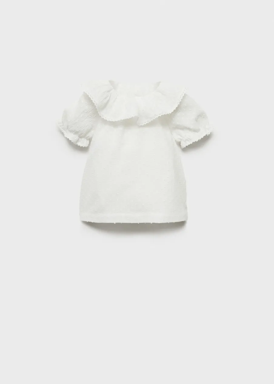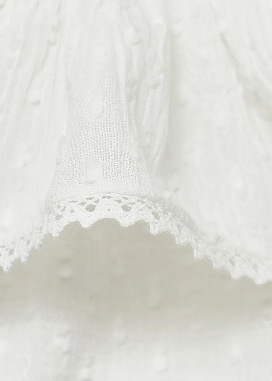 Bawełna 100%. Tkanina plumeti. Krótki rękaw. Kołnierzyk bebe. Zapięcie na guziki. Koronkowe wykończenia.