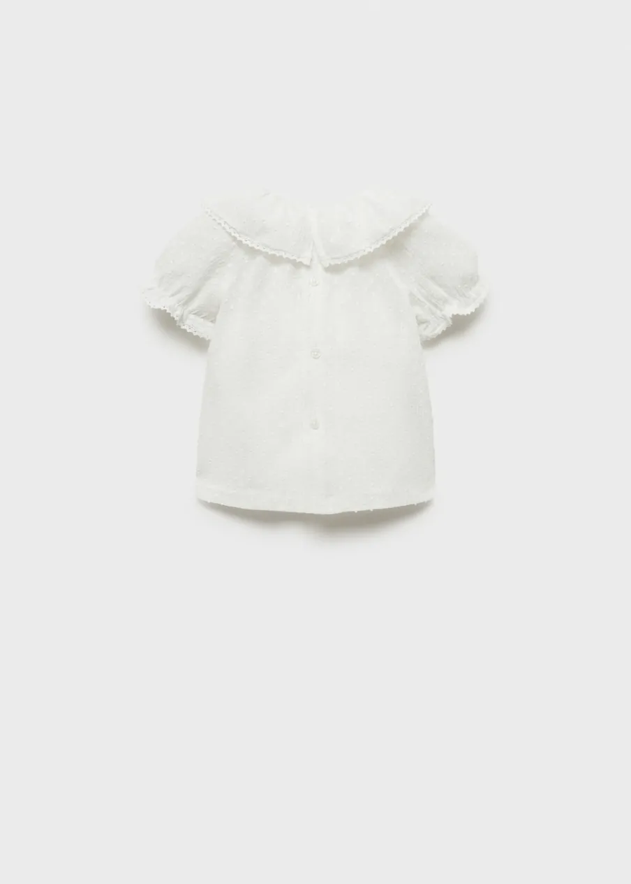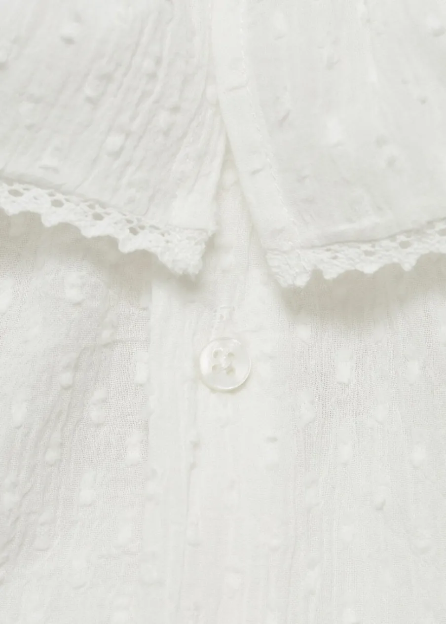 OpisBawełna 100%. Tkanina plumeti. Krótki rękaw. Kołnierzyk bebe. Zapięcie na guziki. Koronkowe wykończenia.
