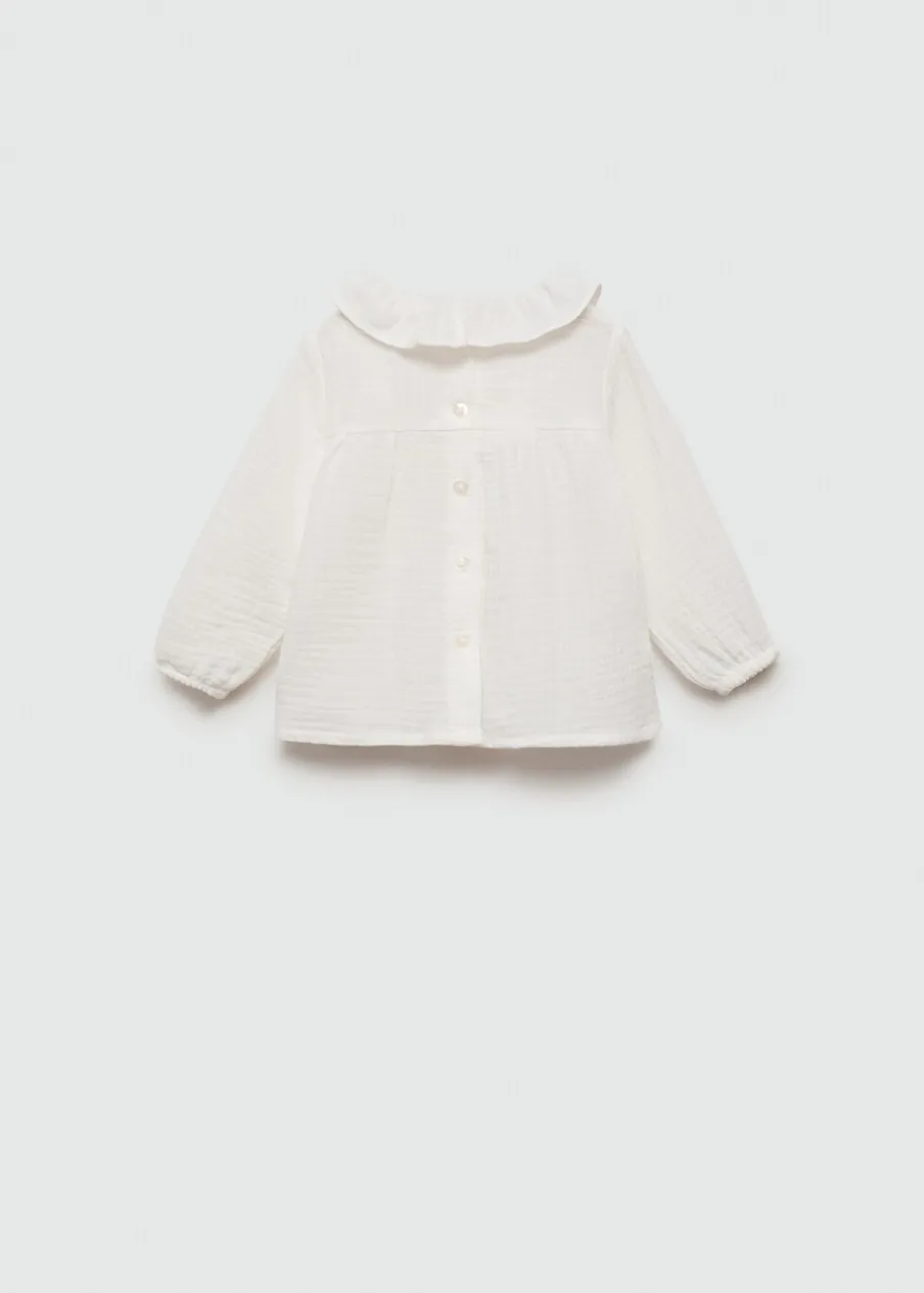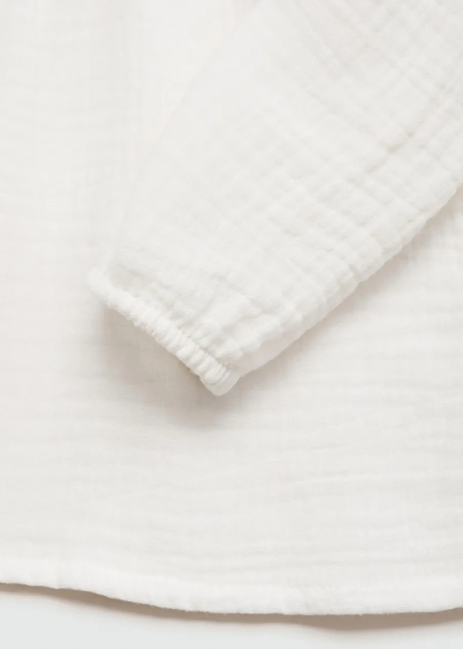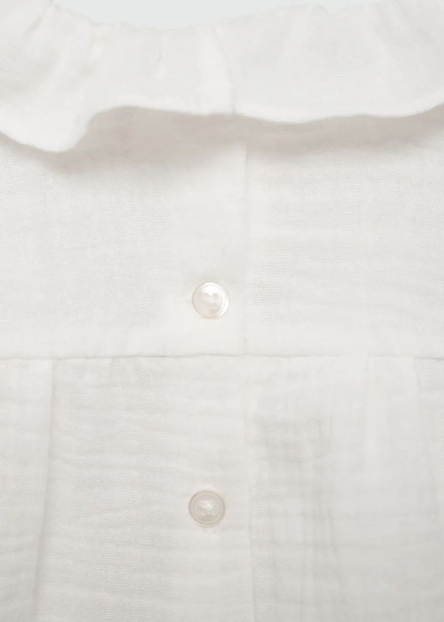 100% bomull. Kreszowana tkanina. Model prosty. Okrągły dekolt. Falbanki pod szyją. Długi rękaw. Zapięcie z tyłu na guziki.