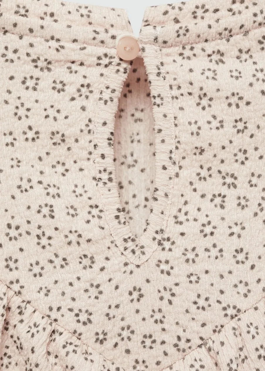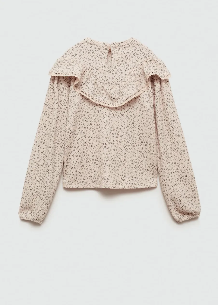 Kolekcja Powrót do szkoły. Model prosty. Długi rękaw. Detal z falbaną. Zapięcie na guzik z tyłu. Okrągły dekolt.