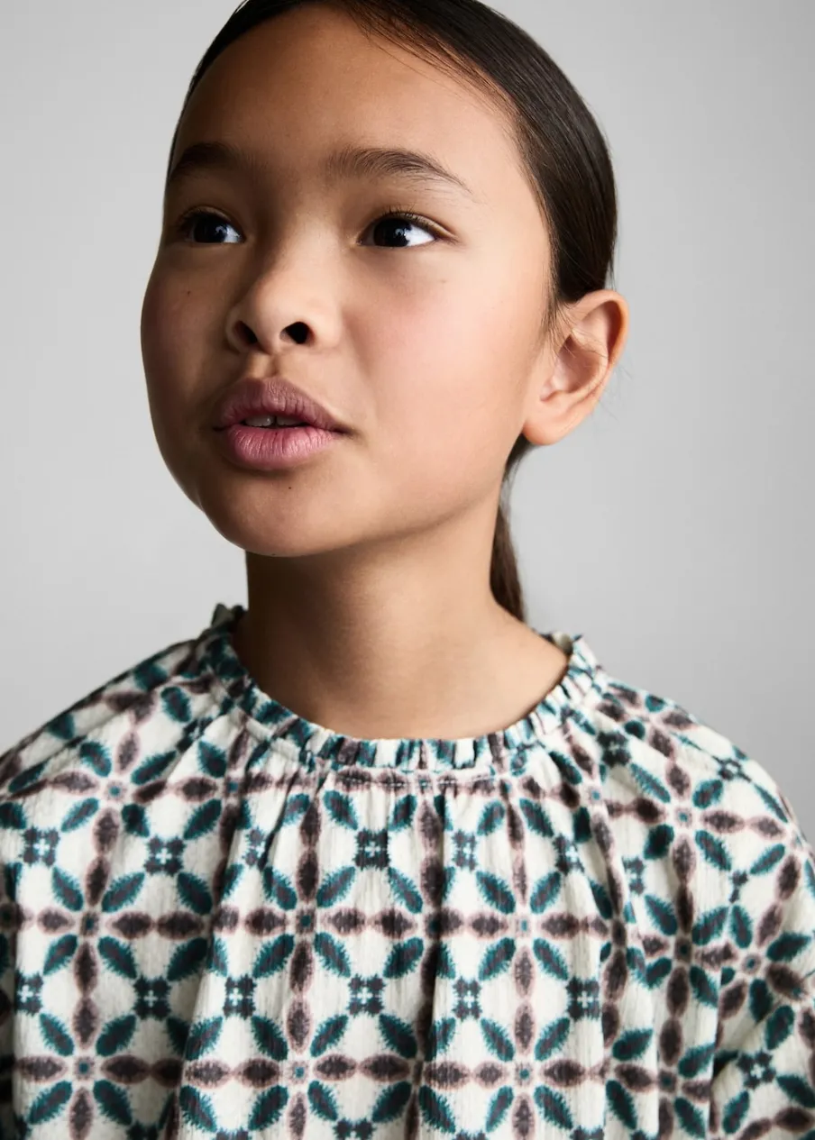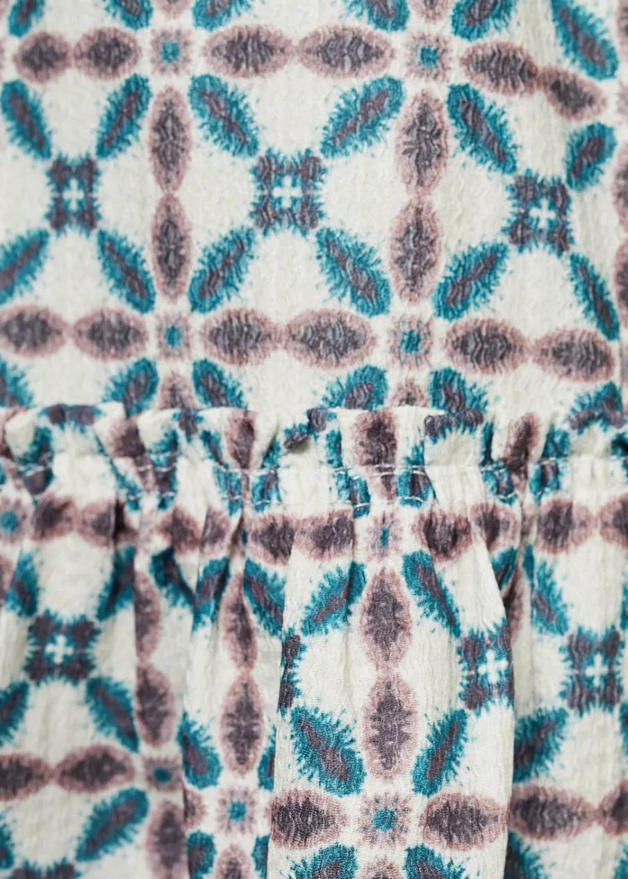 OpisWzorzysty. Styl boho. Bufiasty rękaw. Marszczenie na mankiecie. Falbanka w talii. Zapięcie na haftkę z tyłu.