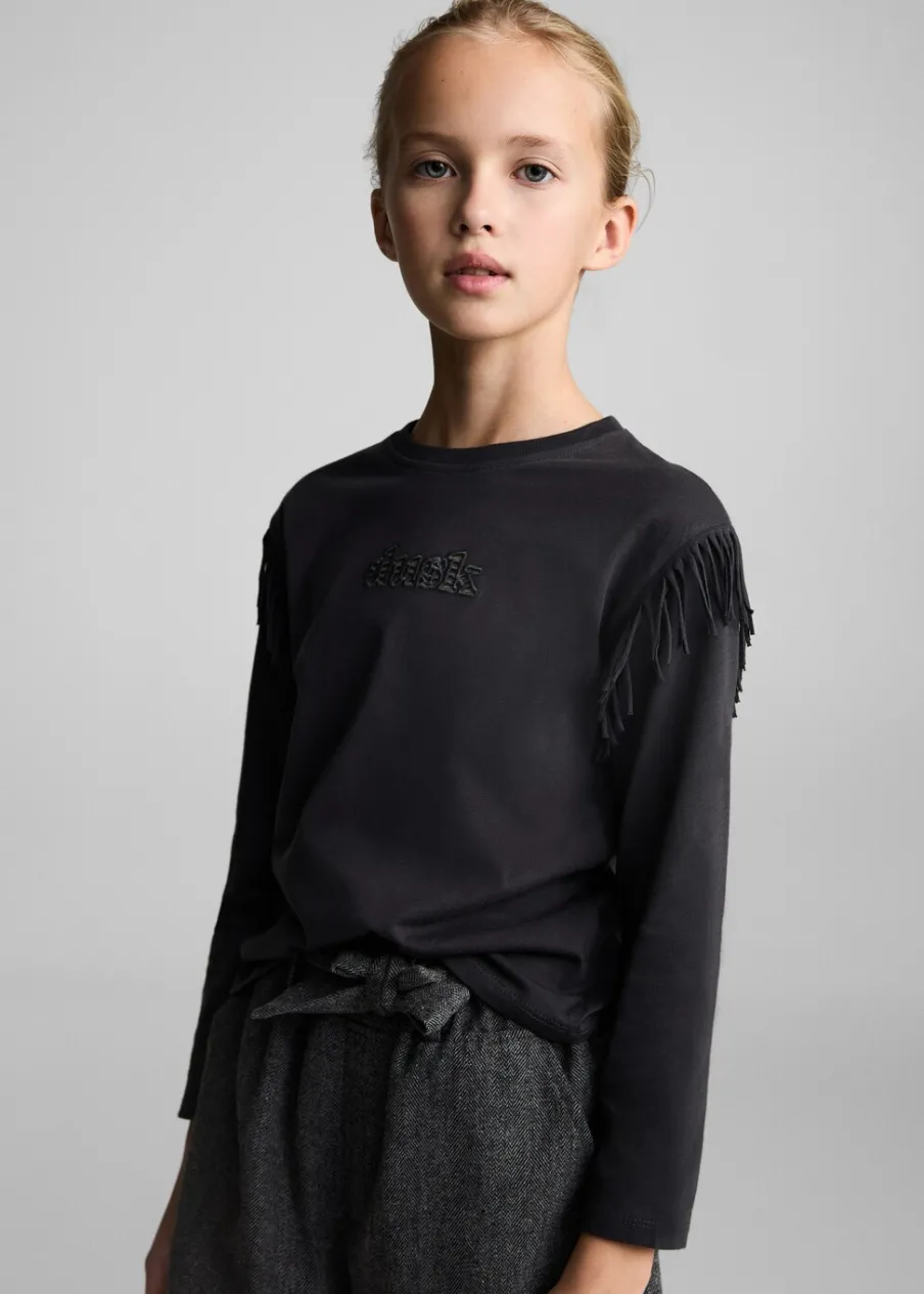 Bawełna 100%. Model prosty. Haftowany detal. Okrągły dekolt. Długi rękaw. Detal z frędzli.