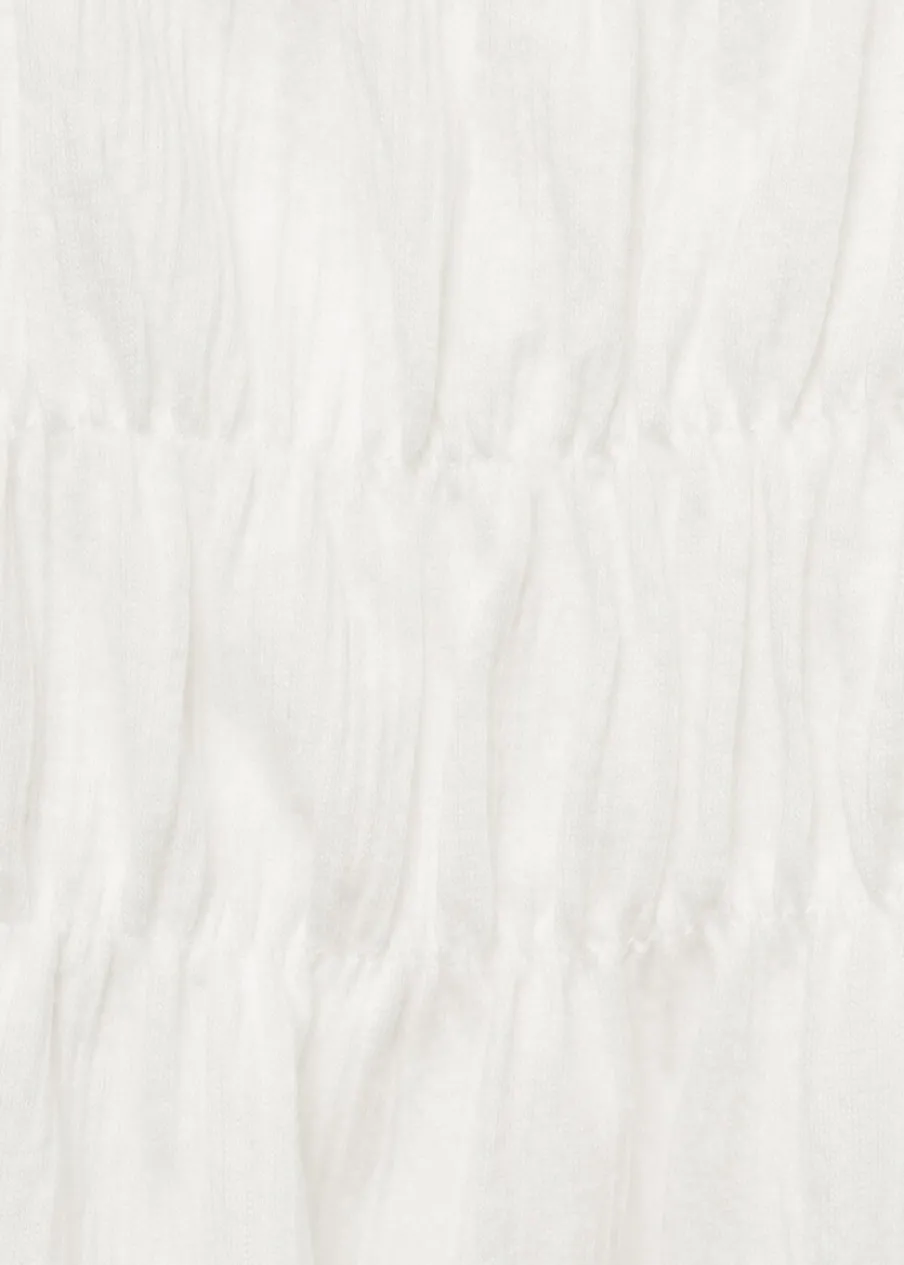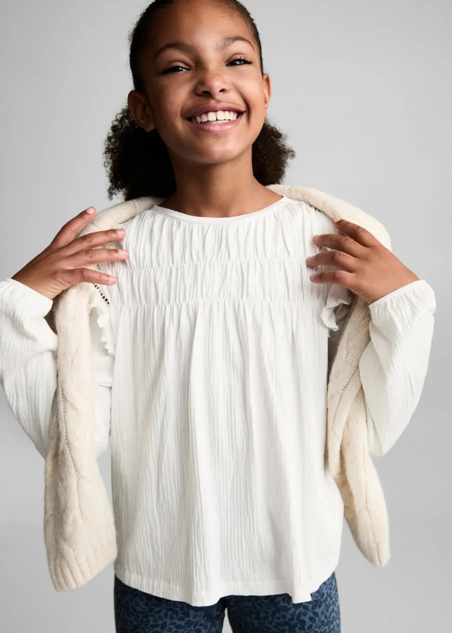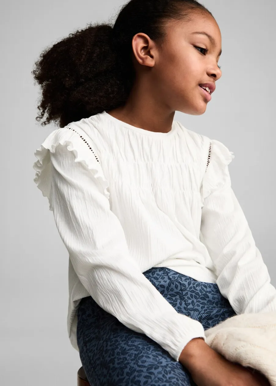 Bawełniana tkanina. Plisowana tkanina. Model prosty. Długi rękaw. Okrągły dekolt. Ozdobne marszczenie. Falbanki na ramionach. Elastyczne mankiety.