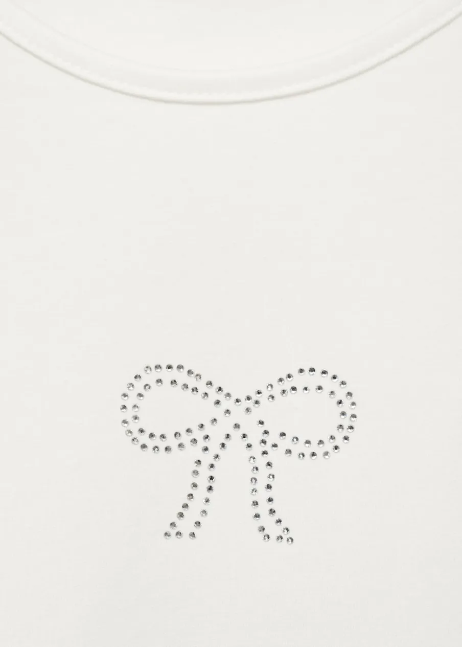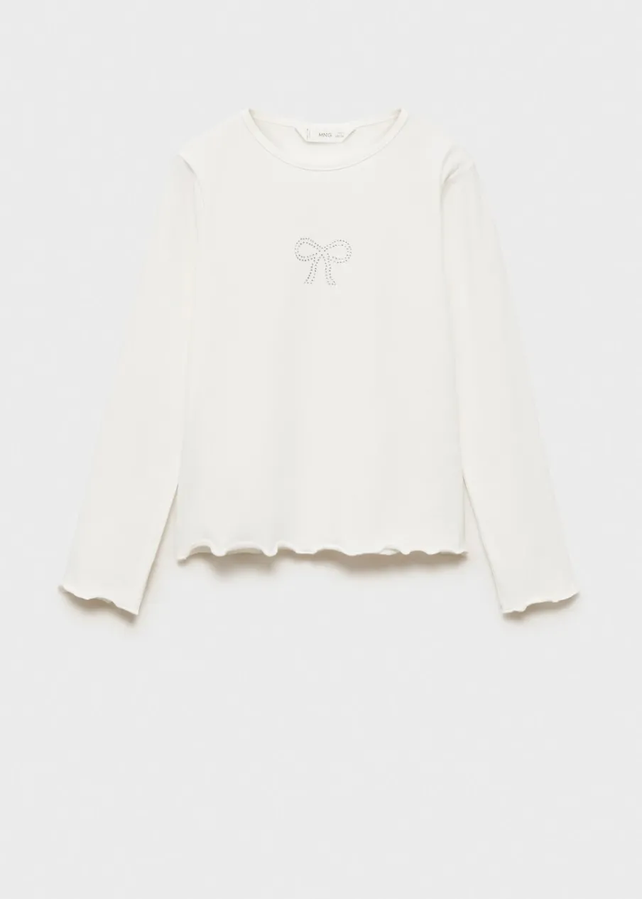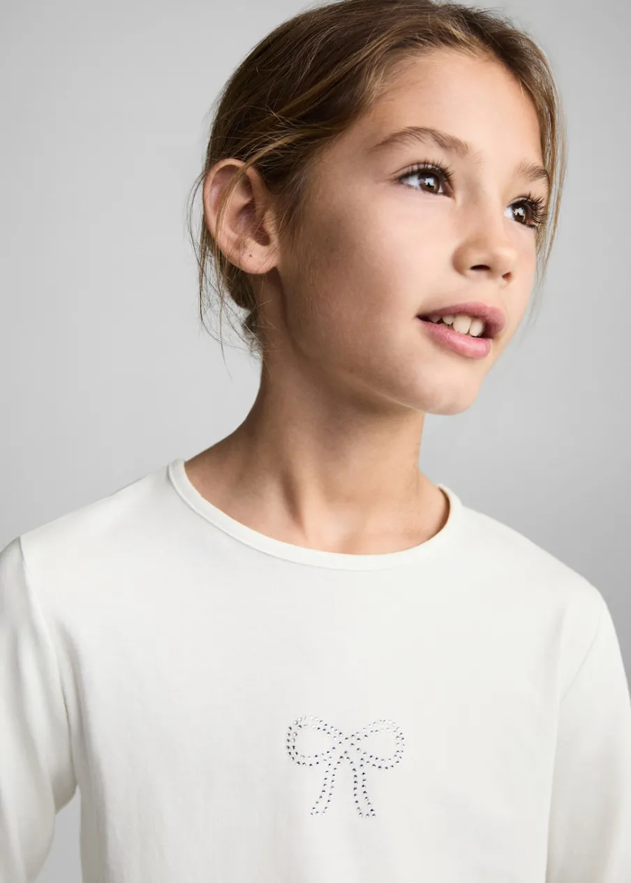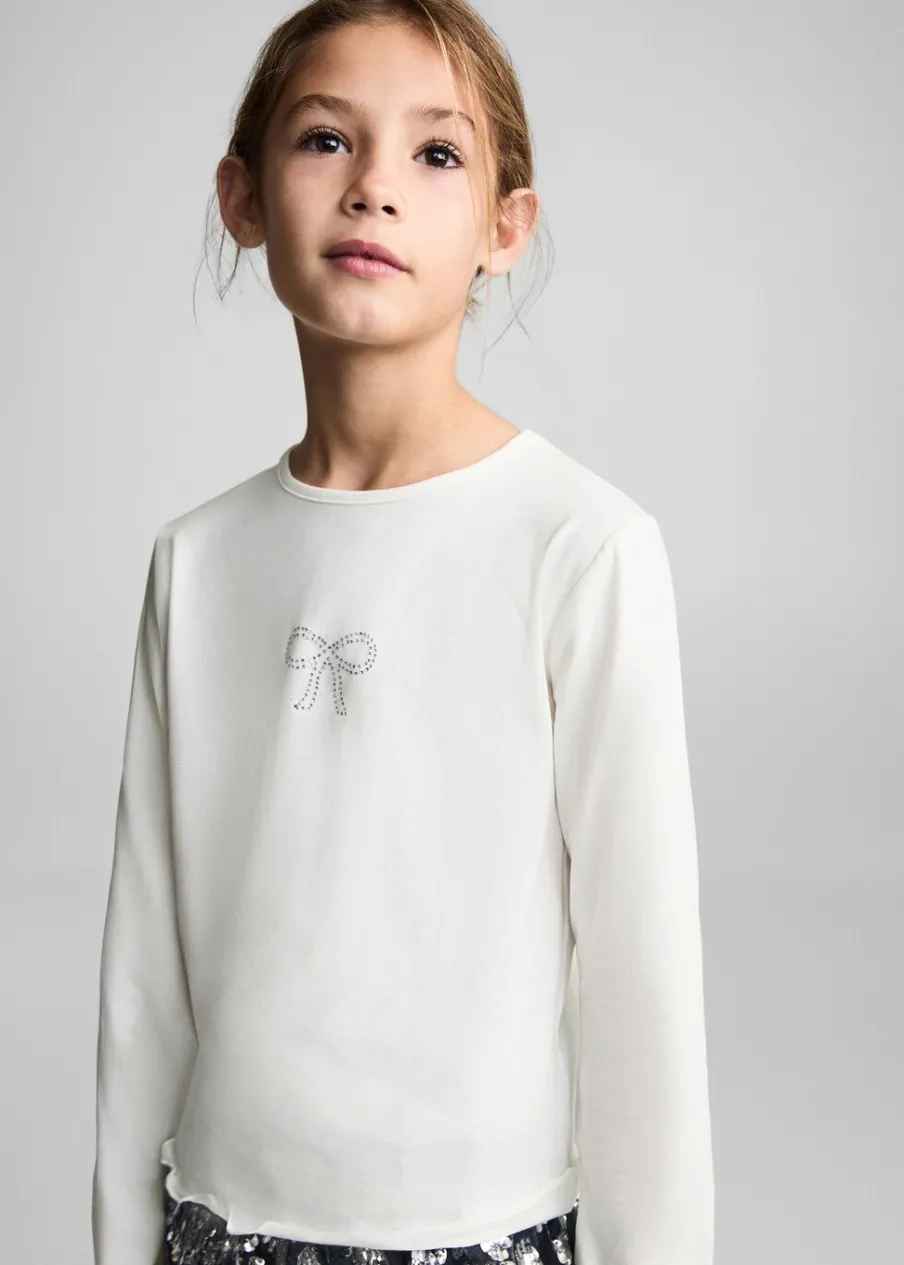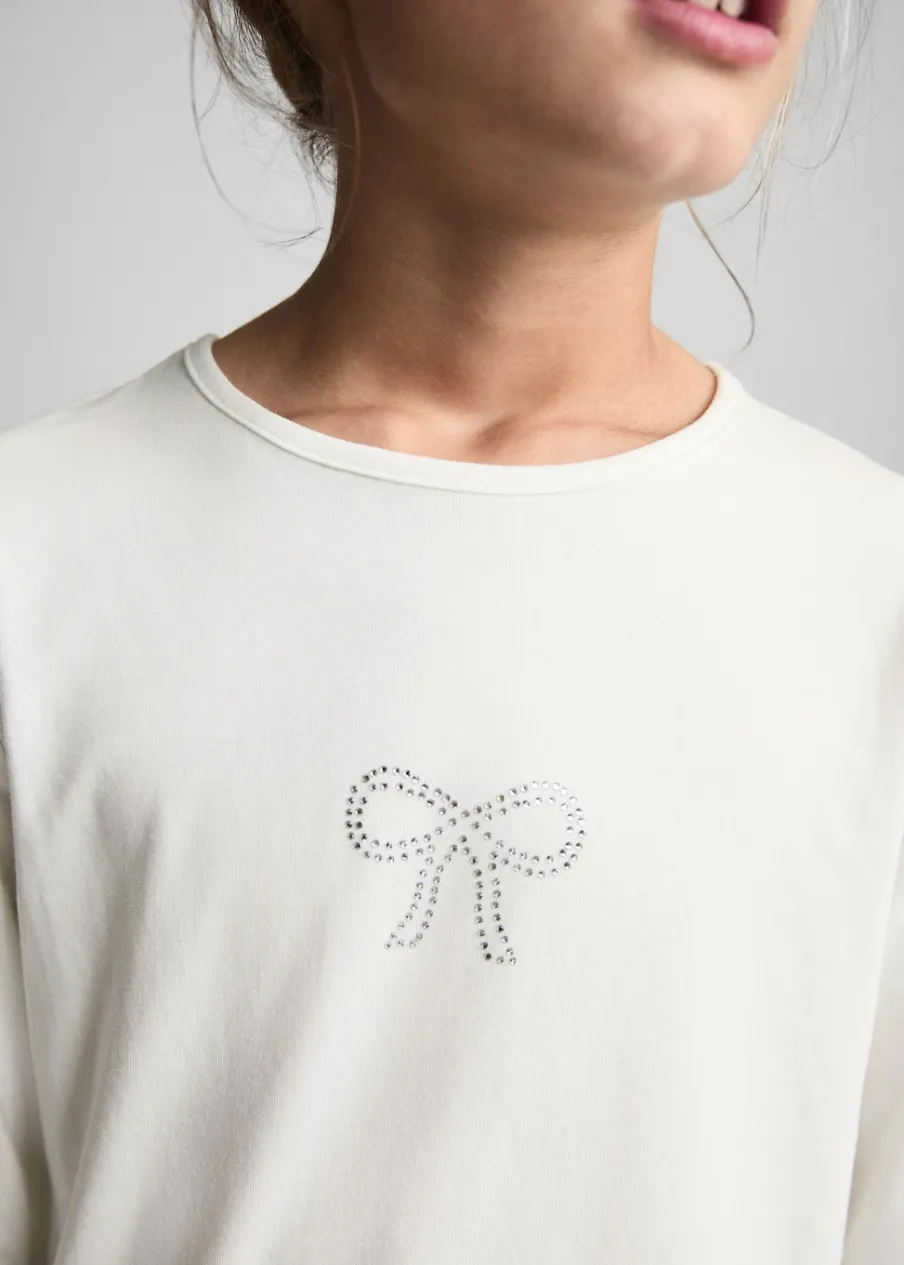 Pamut anyag, kerek nyakkivágás, hosszú ujj, strassz részlettel, dekoratív masni.