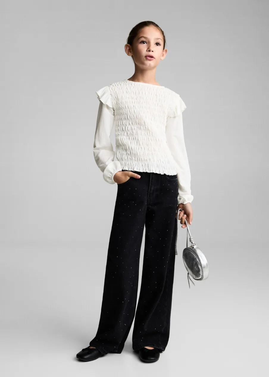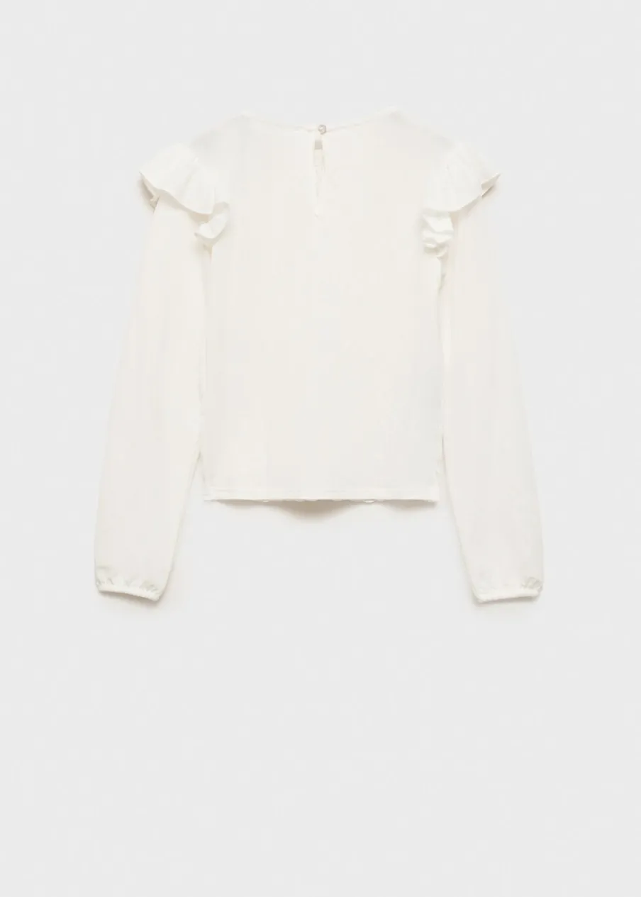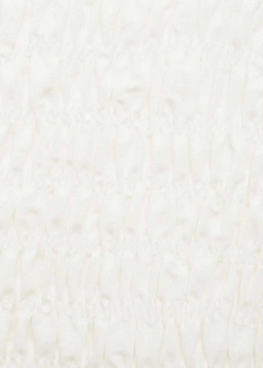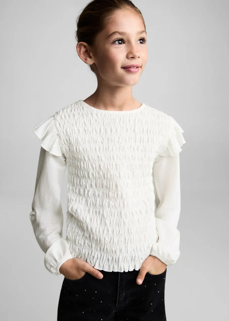 Ráncolt részletek, fordos részletek, hosszú ujj, kerek nyakkivágás, gombos rögzítés.