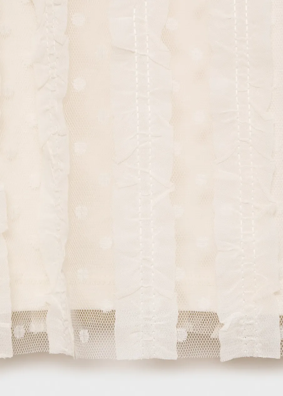 Bawełniana tkanina. Podwójna warstwa. Tkanina plumeti. Krótki rękaw. Marszczona tekstura. Okrągły dekolt z zapięciem na guzik.